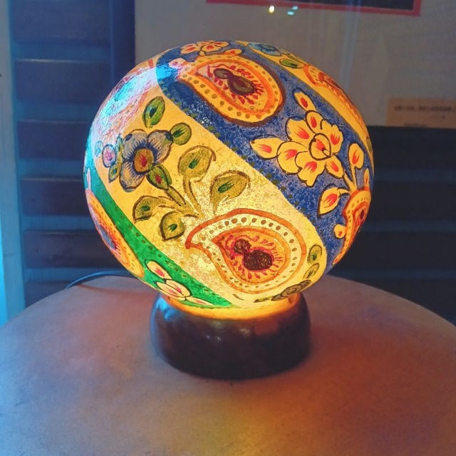 異国情緒あふれる、世界に一つだけのランプ ラクダの胃袋の皮を丁寧に鞣(なめ)して作られた、非常に珍しいキャメルランプです。 職人が一つひとつ手描きで施した色鮮やかなイスラミック文様が、エキゾチックで独創的な雰囲気を醸し出します。 < 独特の温もりと癒し> 本革のシェードを通して漏れる光は、まるで太陽が地平線に沈むときのような、独特の温かみと柔らかさを持っています。お部屋の照明を落とし、このランプを灯せば、日常の喧騒を忘れさせてくれるような、心落ち着く癒しの空間が広がります。 <使うほどに深まる味わい> このランプの最大の特徴は、素材である本革が経年変化(エイジング)していくことです。長年お使いいただくことで、表面の革が飴色のように深く味わいのある色へと変化し、ご自宅だけの特別な風合いが生まれます。 時と共に成長する、一生もののランプとして、ぜひあなたのお部屋にお迎えください。 素材: ラクダの胃袋の皮(本革) デザイン: 手描きイスラミック文様 サイズ: ランプシェード16cm 台座込みの高さ 20cm