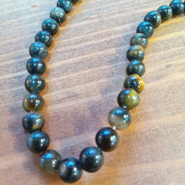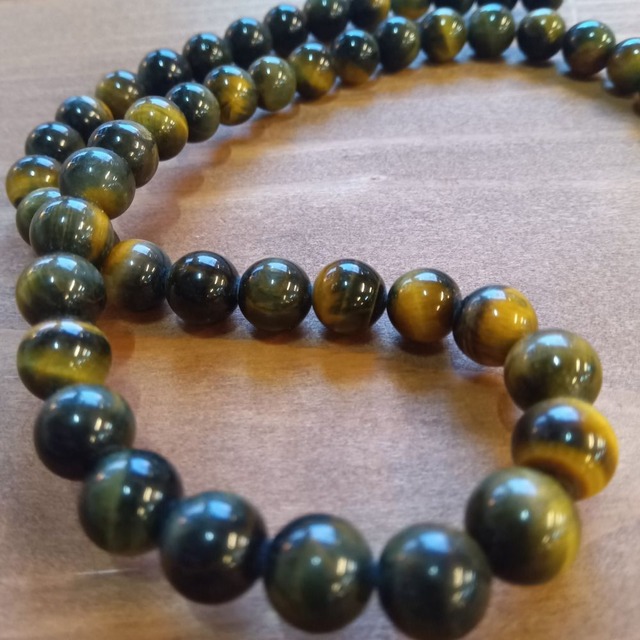 【夜空に浮かぶ一筋の光】深みのある藍と輝き 深い紺青色の中に、虎の目のような鋭い光を宿す「ブルータイガーアイ(和名:青虎目石)」。別名ホークスアイ(鷹目石)とも呼ばれ、冷静な判断力と洞察力を高める「成功の石」として古くから愛されてきました。 深い藍色をベースに、鮮やかなイエローのラインが混じり合う、非常に表情豊かなブルータイガーアイです。粒によってはグリーンがかって見えるものもあり、一連の中で天然石らしい色のグラデーションを楽しめます。 美しいシャトヤンシー: 粒ごとに異なる表情を見せ、光の角度で神秘的なシラー(光の筋)が浮かび上がります。 ※メール便での発送になります。代引き、日時指定はできません。 仕様 石の種類: ブルータイガーアイ(天然石) 粒サイズ: 約8mm 重量: 約35g(一連:約45個) 状態: 新品・未使用