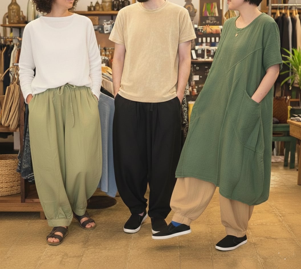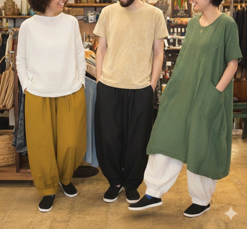 「着こなしを遊べる一着」 男性なら足元をジャストに、女性なら裾にボリュームをたっぷり溜めて。 一見、足元がもたつくように感じるかもしれませんが、その「くしゅっ」とした溜まりこそが、今の空気感にぴったりの「こなれ感」を演出してくれます。