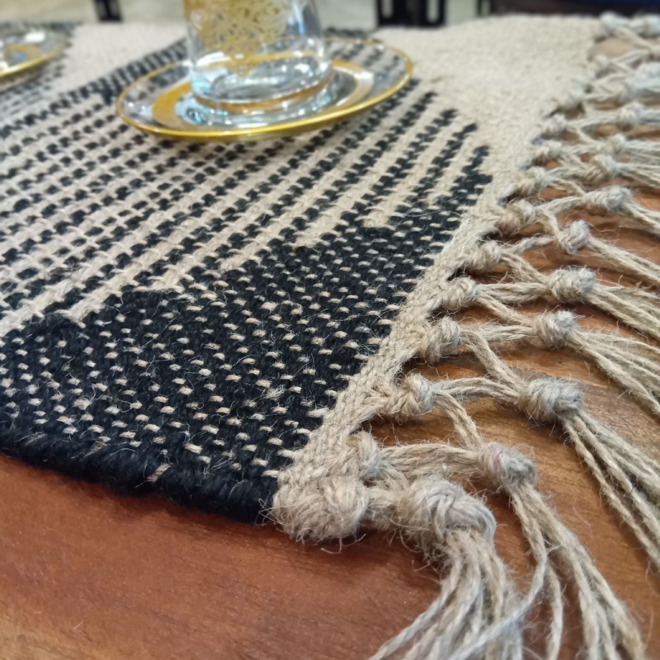 ブラックとナチュラルの色合いが、シックで落ち着いた印象を与え、食卓をぐっとおしゃれに彩ります。フリンジをアクセントにしたデザインは、敷くだけでいつものテーブルをワンランク上の空間に変えてくれます。