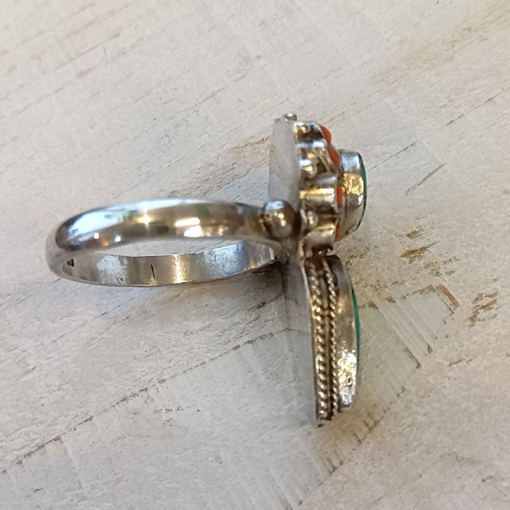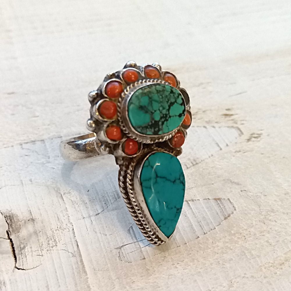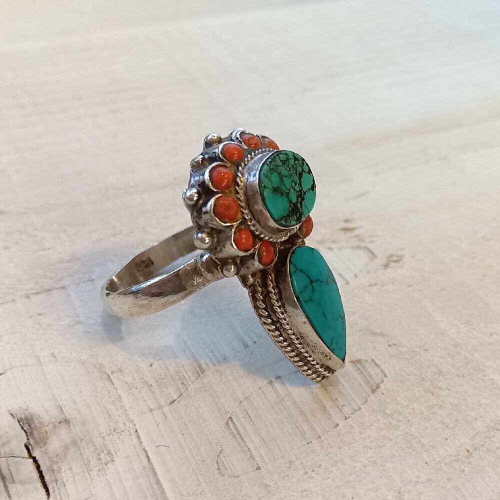 シルバーリング 925 ターコイズ コーラル スパイダーウェブ ネパール エスニック ハンドメイド 一点物 ジュエリー