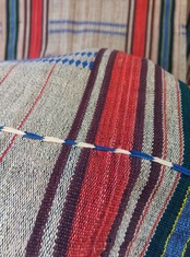 素朴で力強い風合いの厚手な生地に、ナガ族独特の幾何学模様と色鮮やかなストライプ柄が織り込まれています。