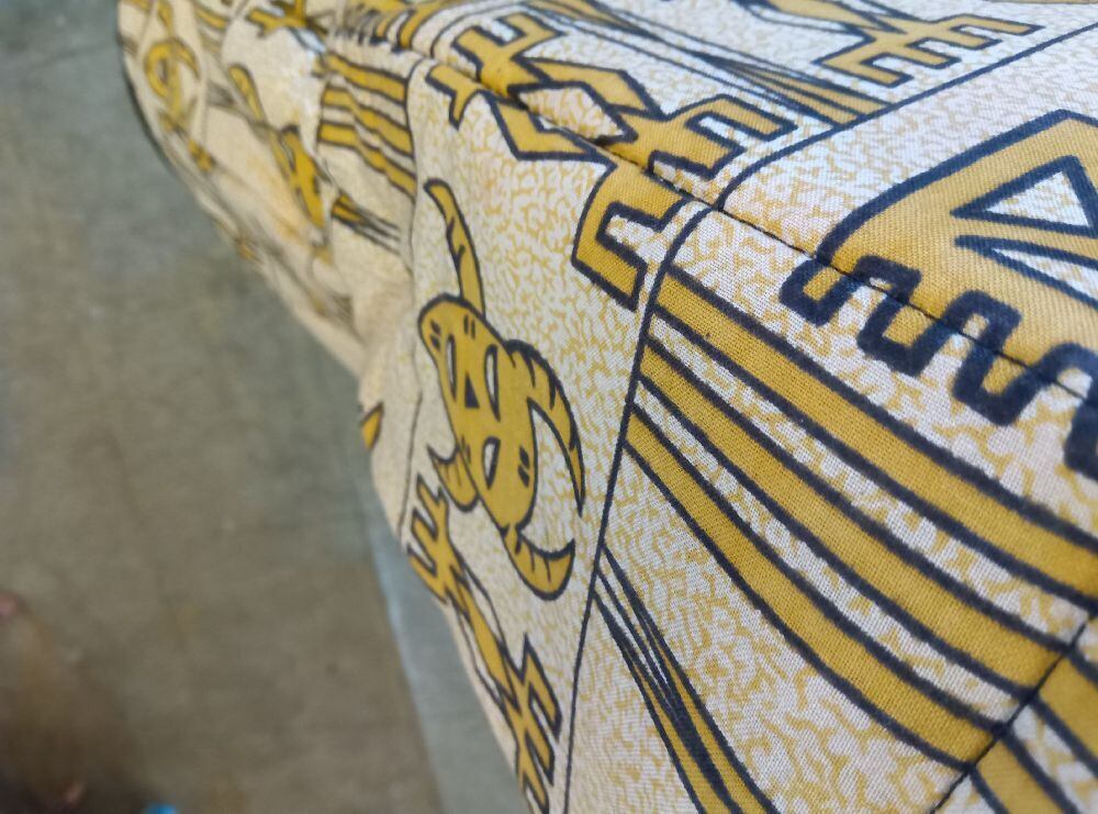 外部にはアフリカンテイストの柄がプリントされた布地を使用。