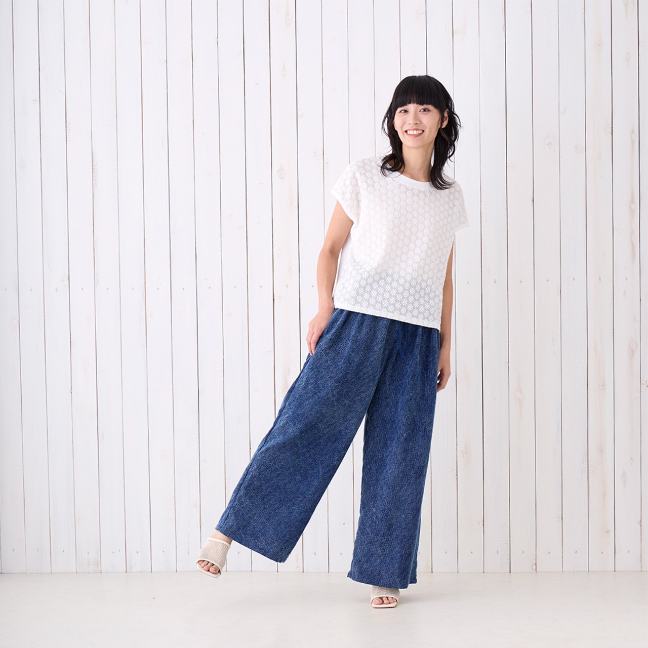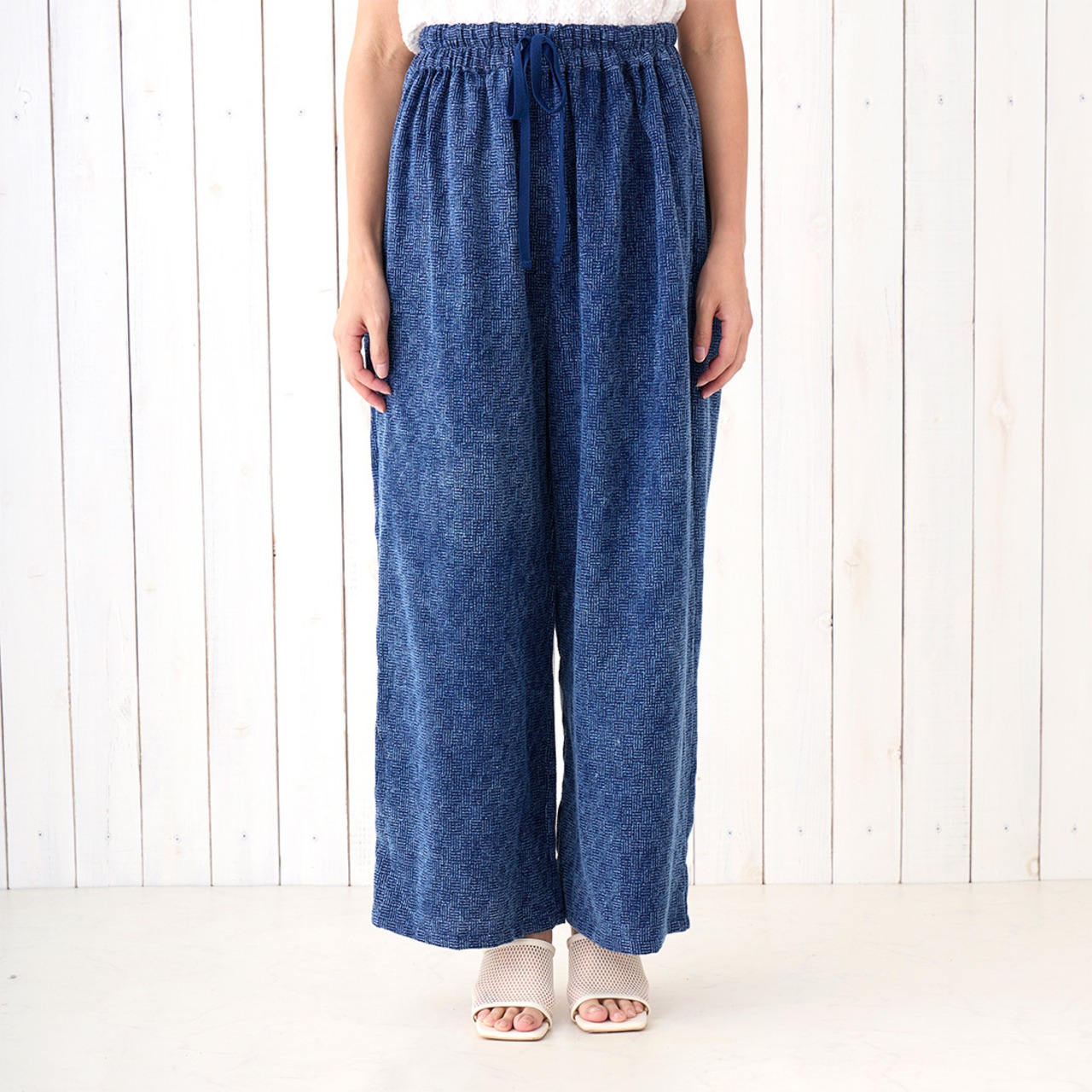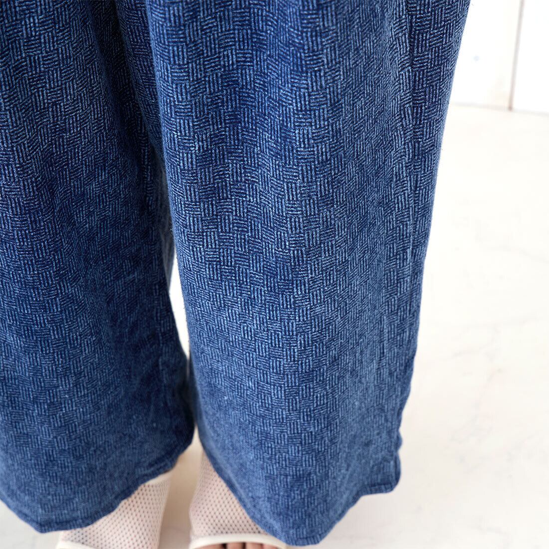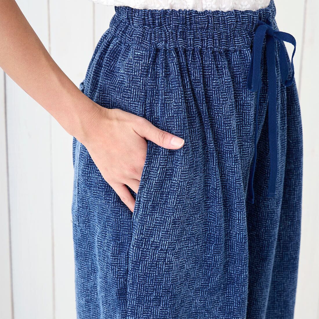 特徴: 格子状の凹凸のある生地、インディゴ染め、前後ポケット付き、ウエストゴムと紐