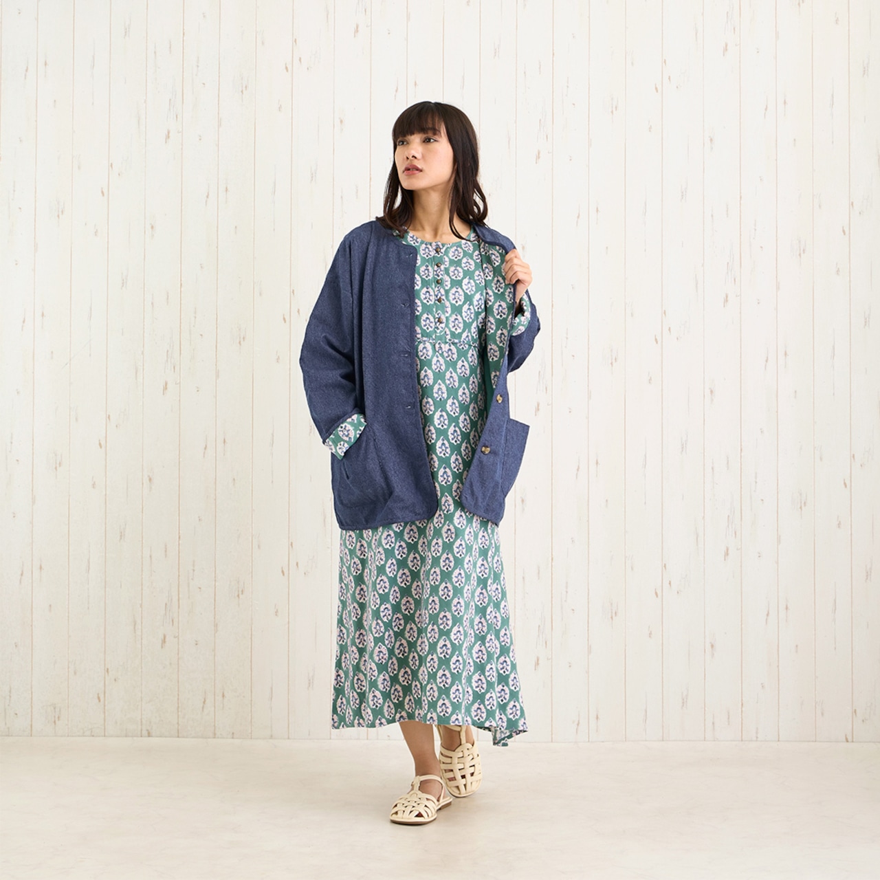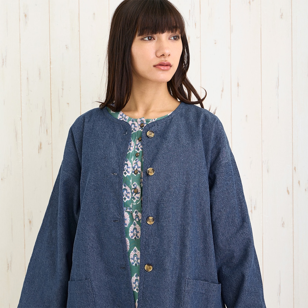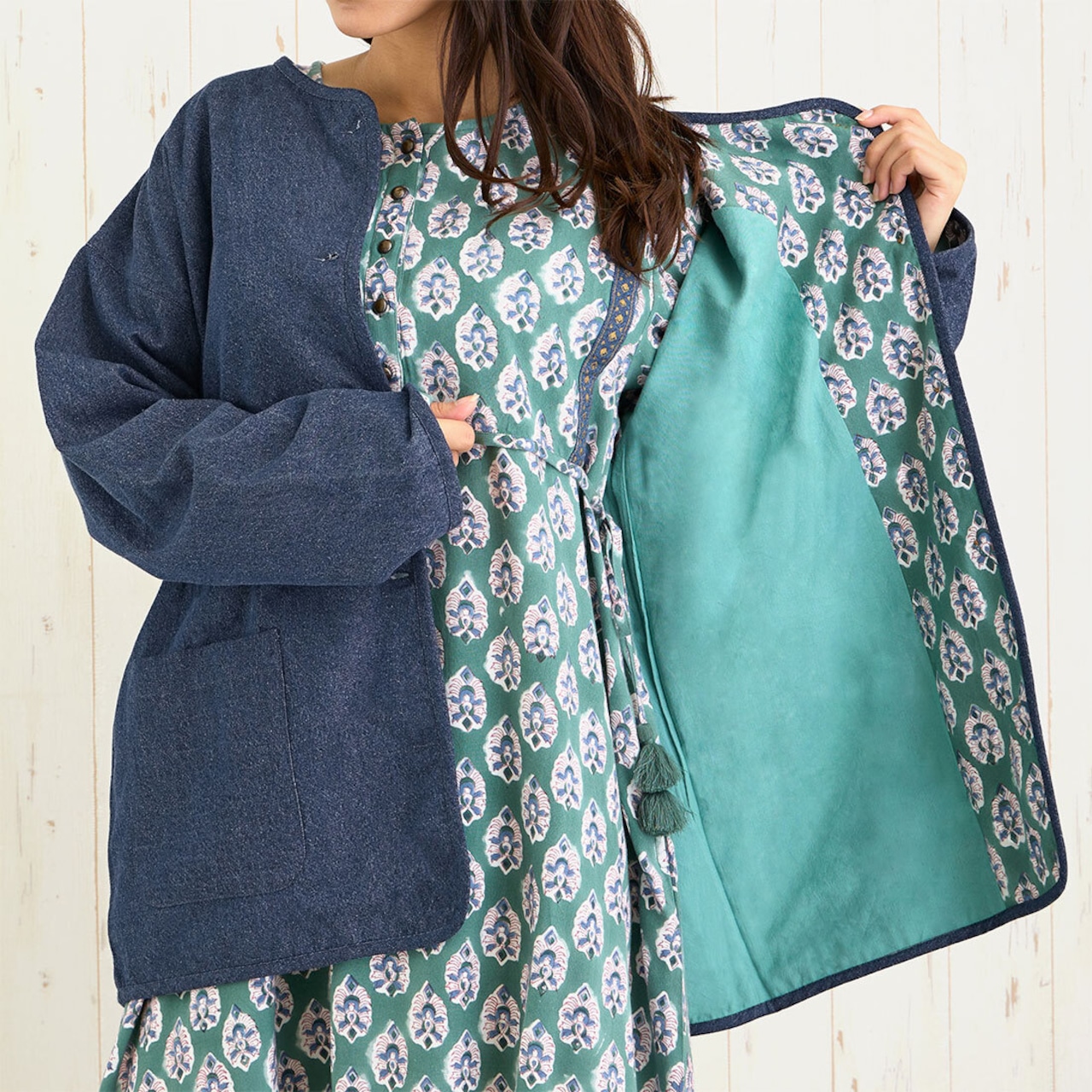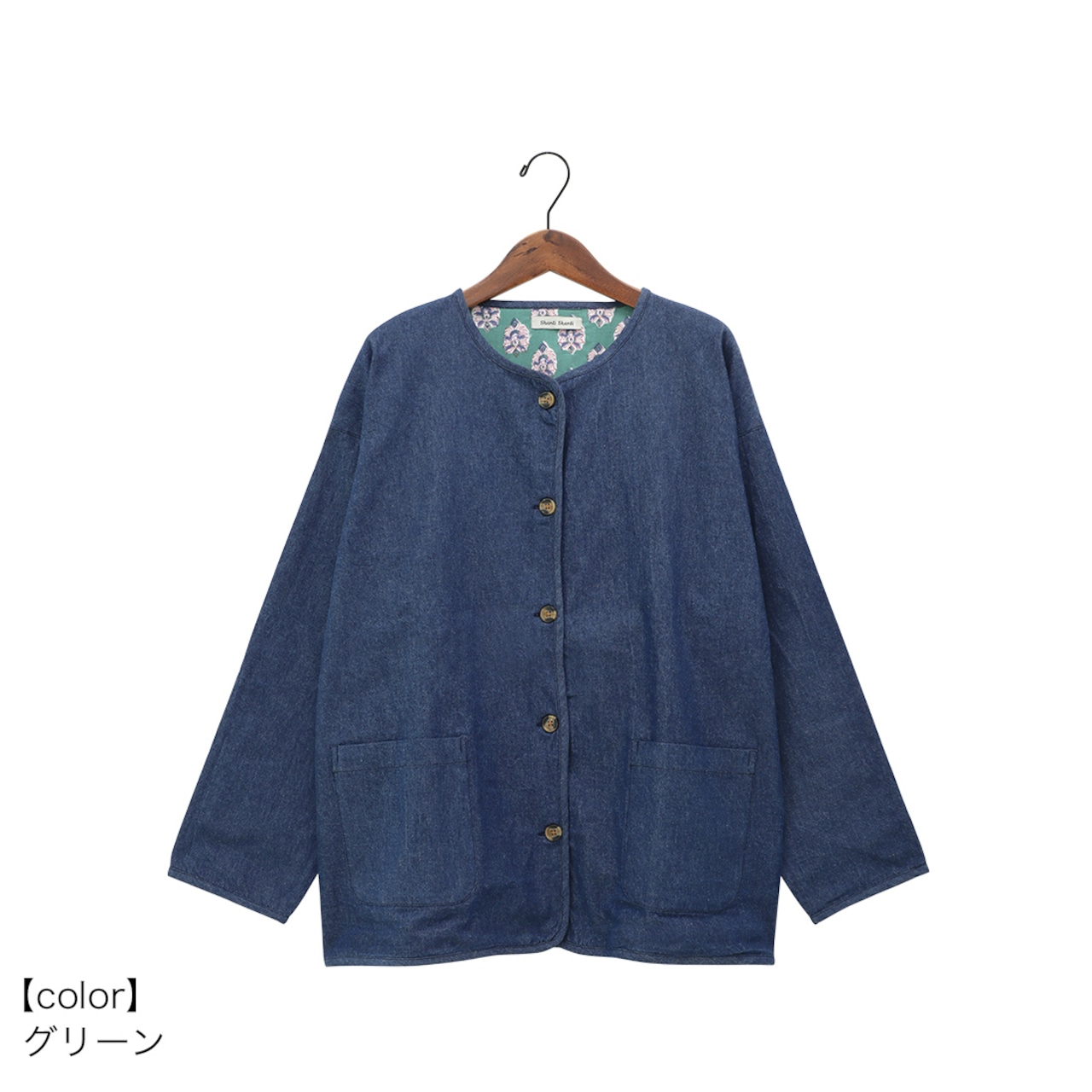 デニムジャケット コットン リラックス ゆったり ナチュラル カジュアル 羽織り 綿100% 裏地付き デニム インド 職人技 繊細 ブロックプリント 7.75oz コットンレーヨン
