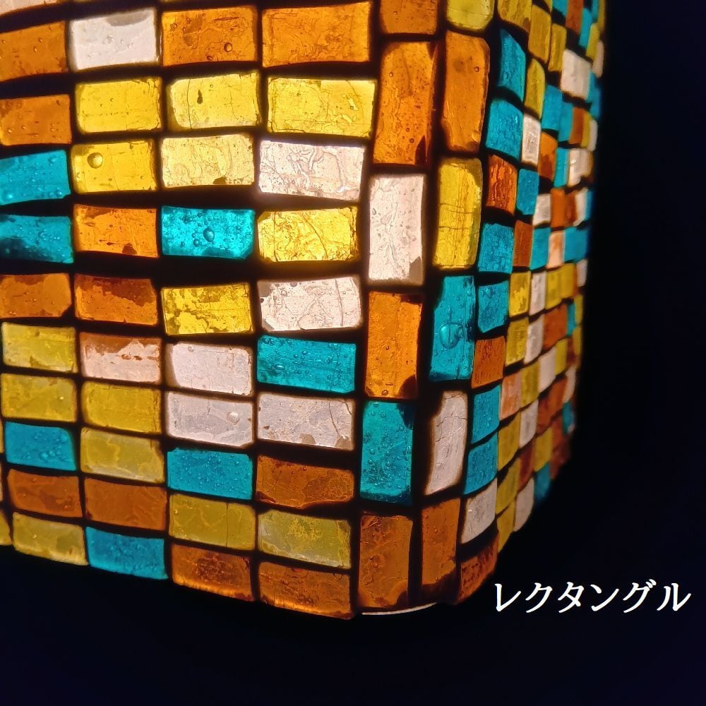 灯をともせば、モザイクガラスの奥から幻想的な光が溢れ出し、心地よい暖かさを感じさせます。一方、消灯時にはシンプルなおしゃれさが際立ち、インテリアのアクセントとしてスマートにお部屋に溶け込みます。