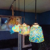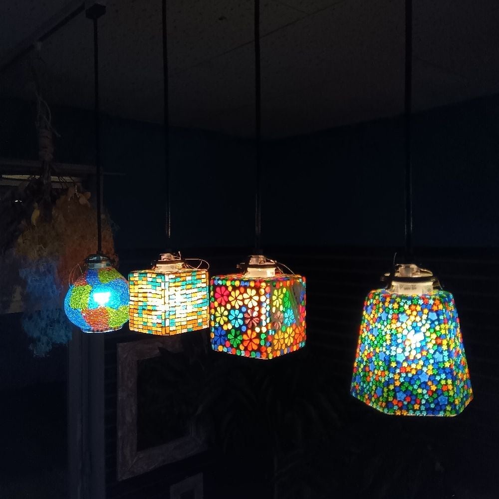 美しいモザイク模様が魅力的なハンギングランプは、石膏にガラスを組み合わせた独特のデザインが特徴です。点灯時と消灯時で異なる表情を楽しむことができ、いつもの空間を華やかに彩ります。