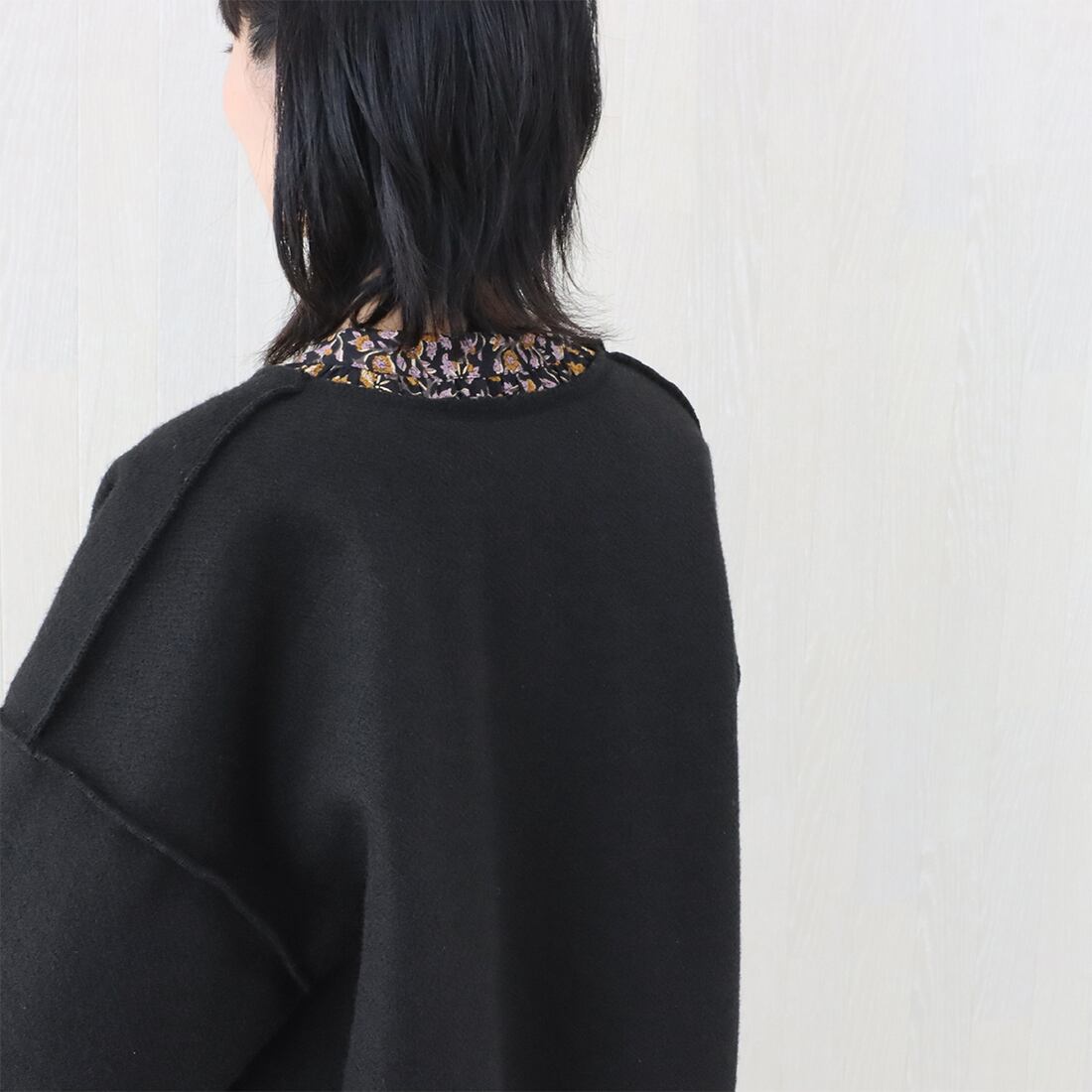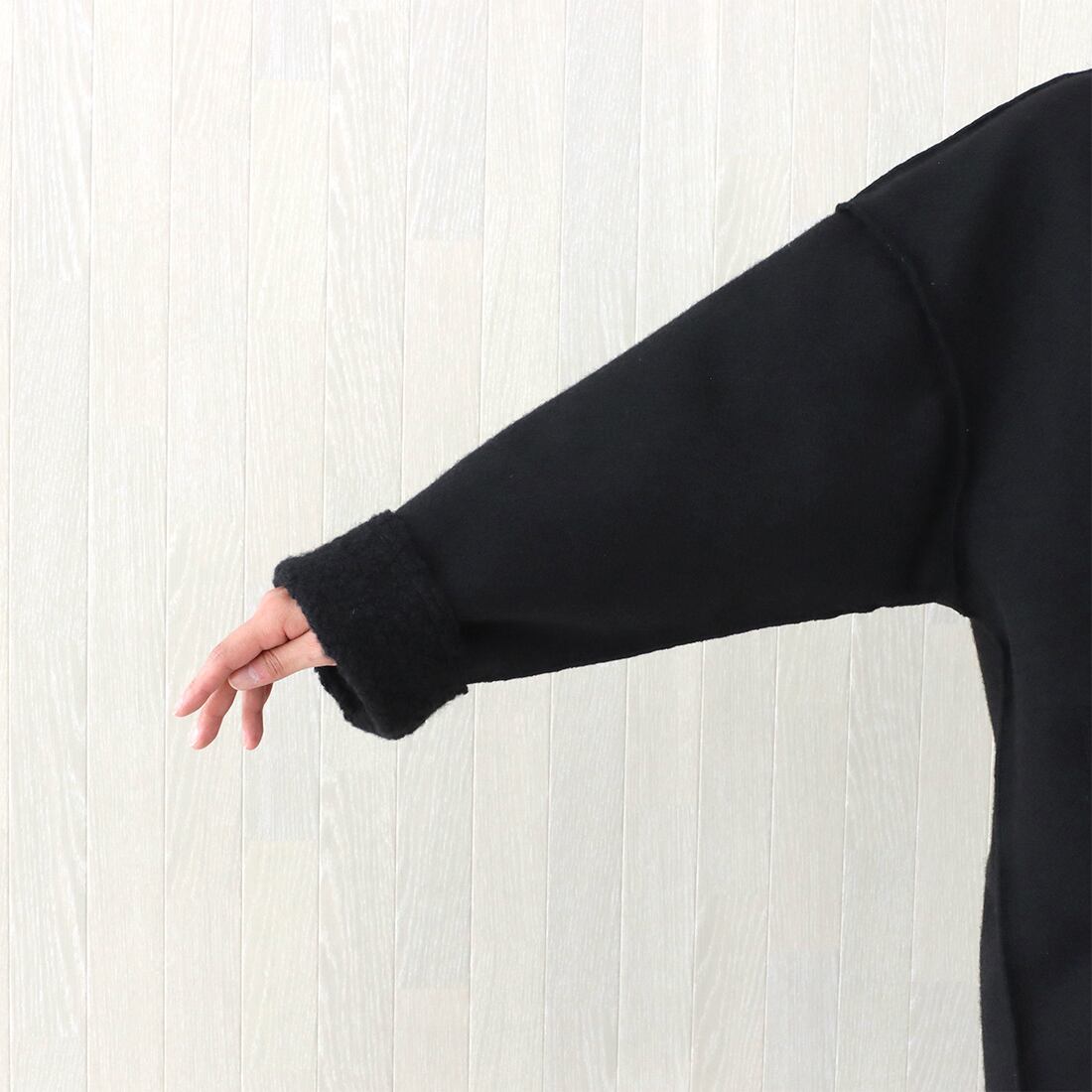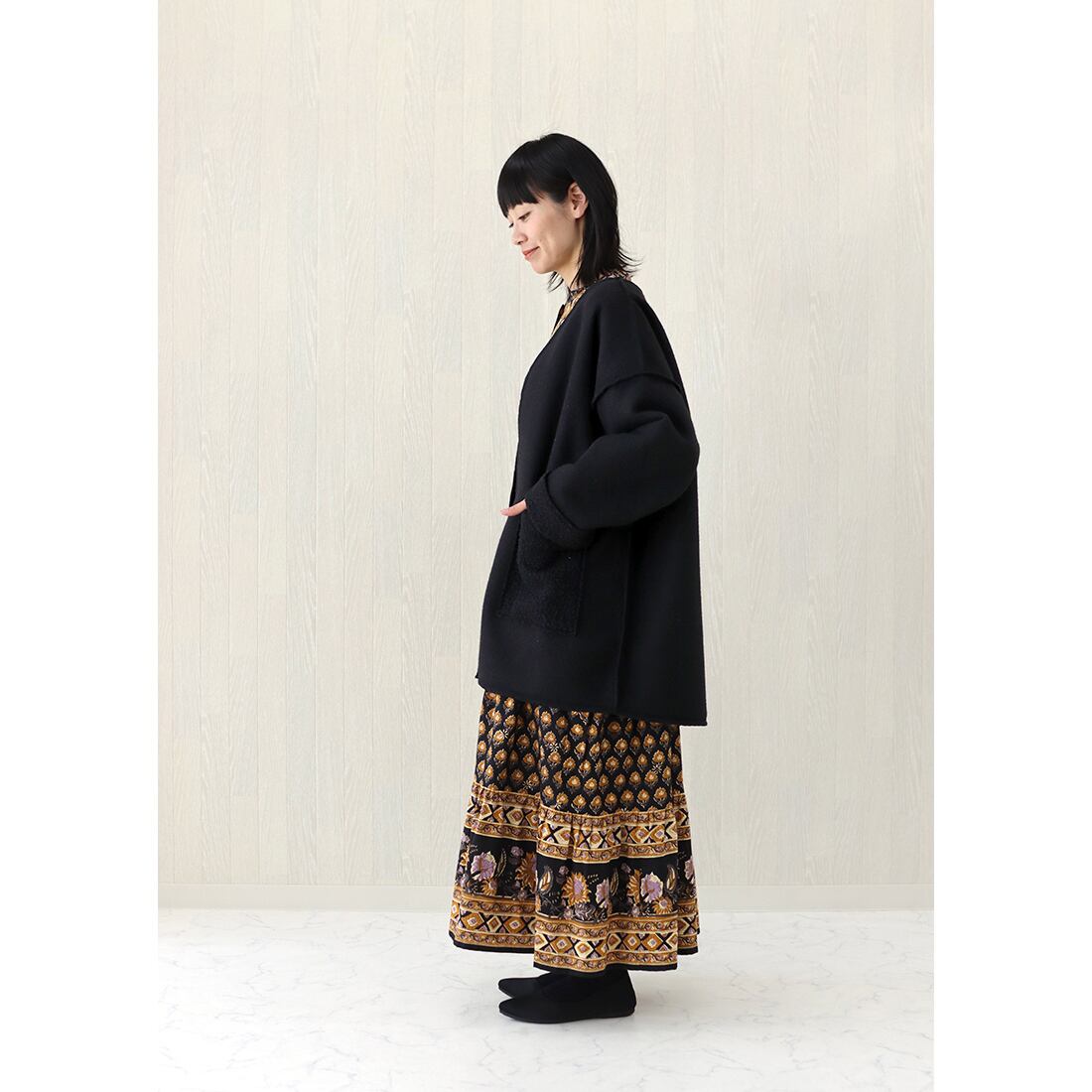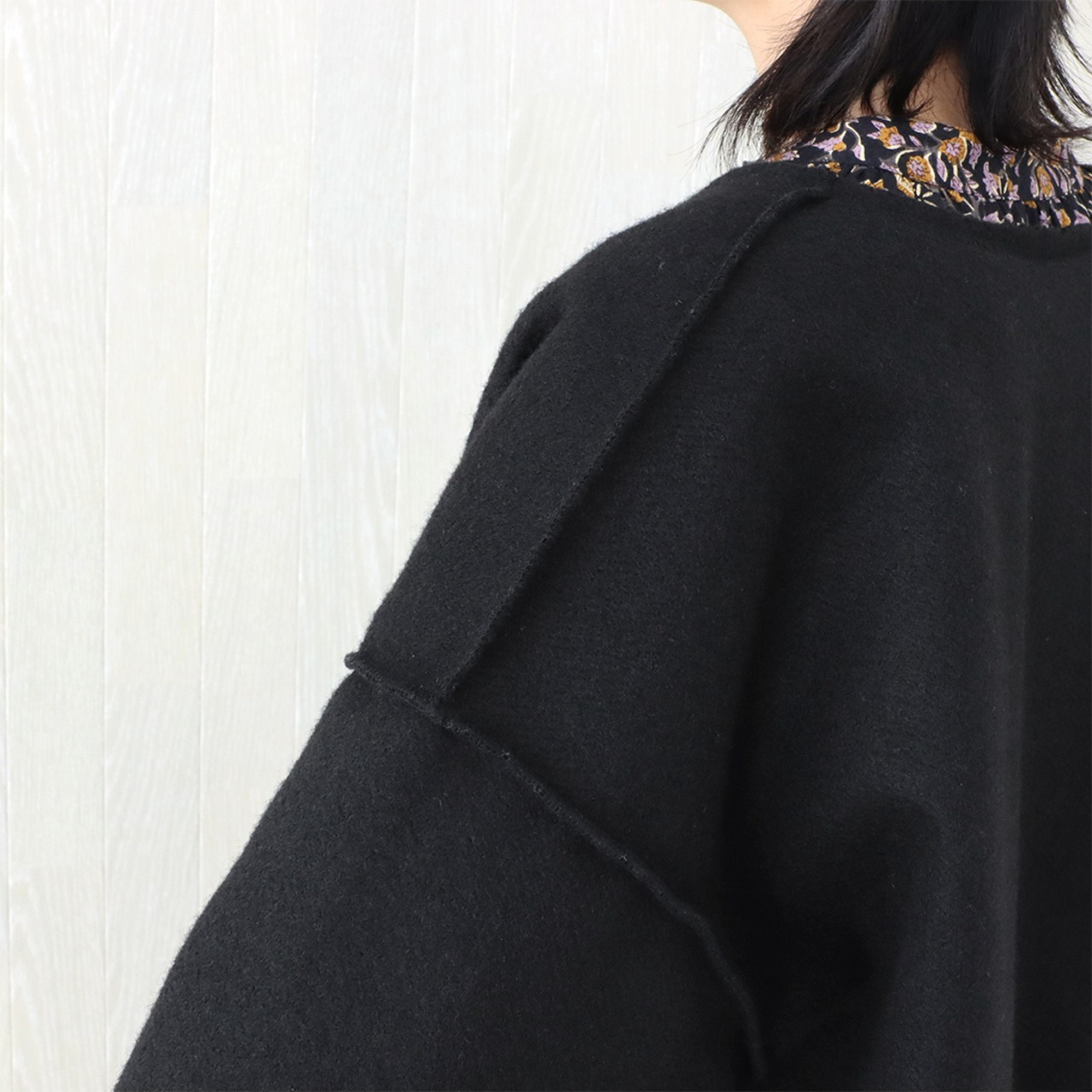 また、ゆったりとしたバストフリーのサイズ感とドロップショルダーで、厚手のニットの上にも羽織りやすく、リラックス感のある着心地です。