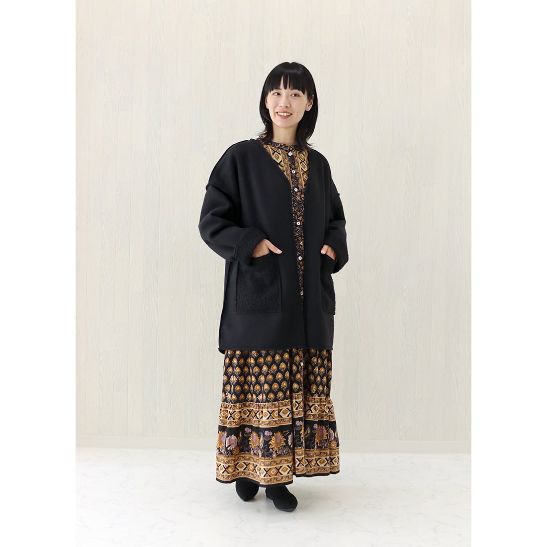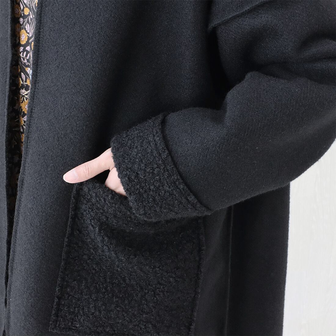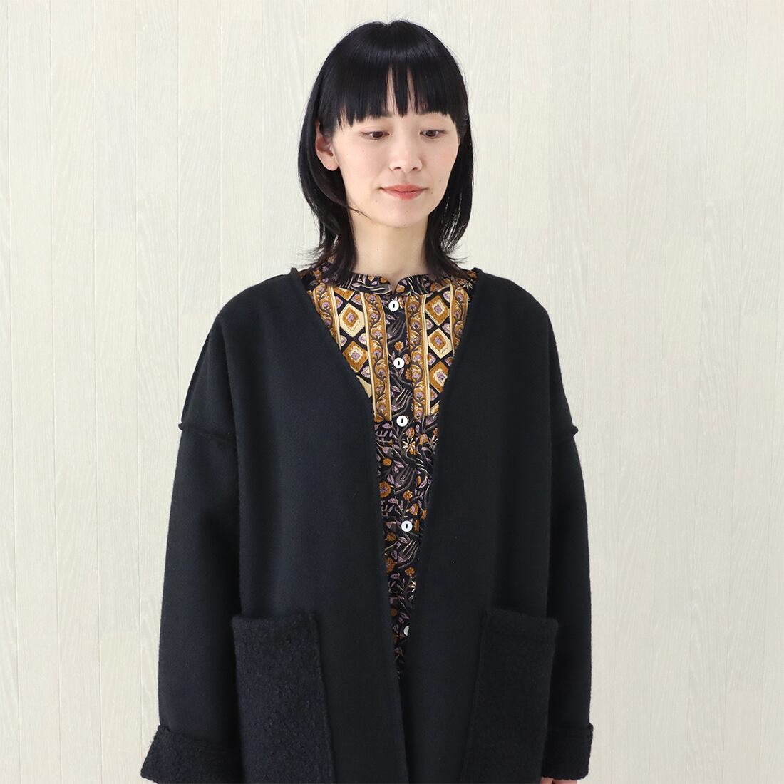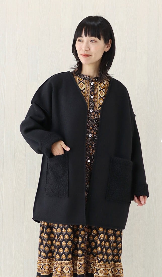 表面がループ状になった、地厚で暖かみのあるブークレー(Bouclé)生地を両面に使用したリバーシブルコートです。
