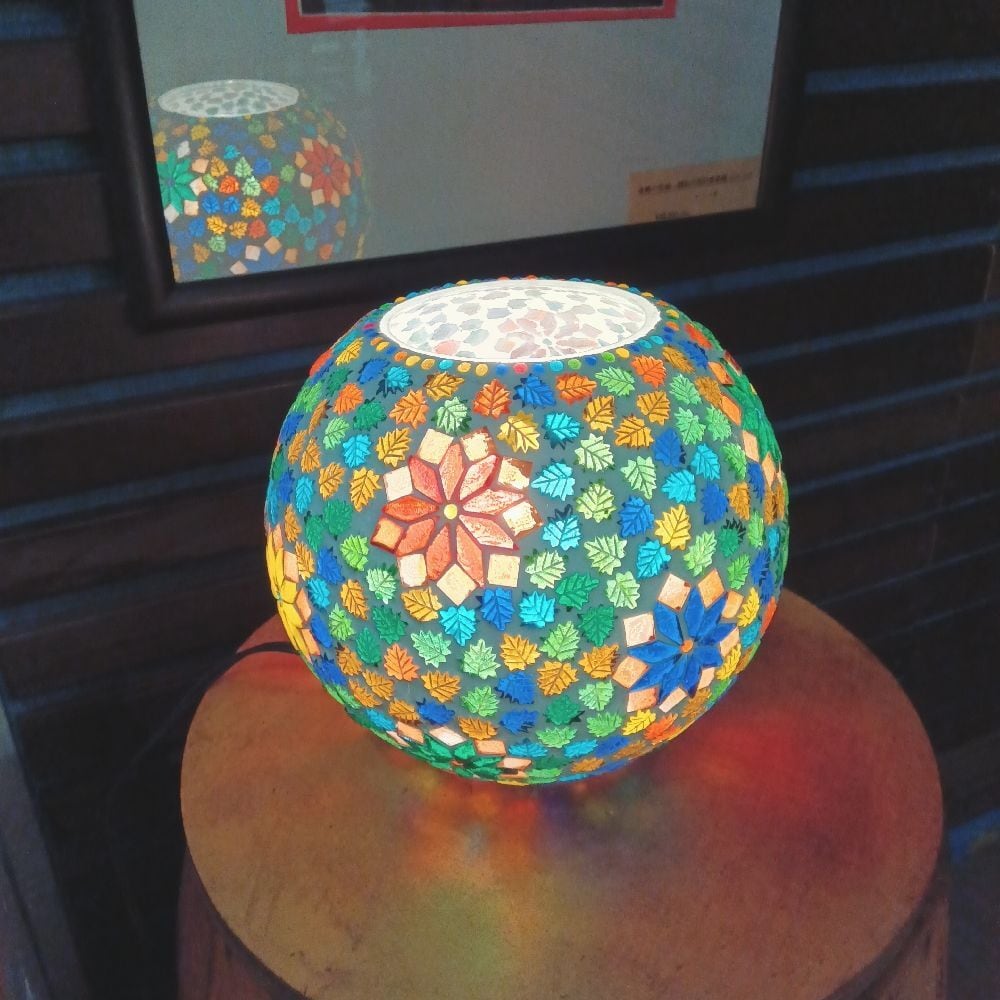 点灯時と消灯時、二つの異なる美しさを楽しめる、熟練の職人技が光るモザイクランプです。