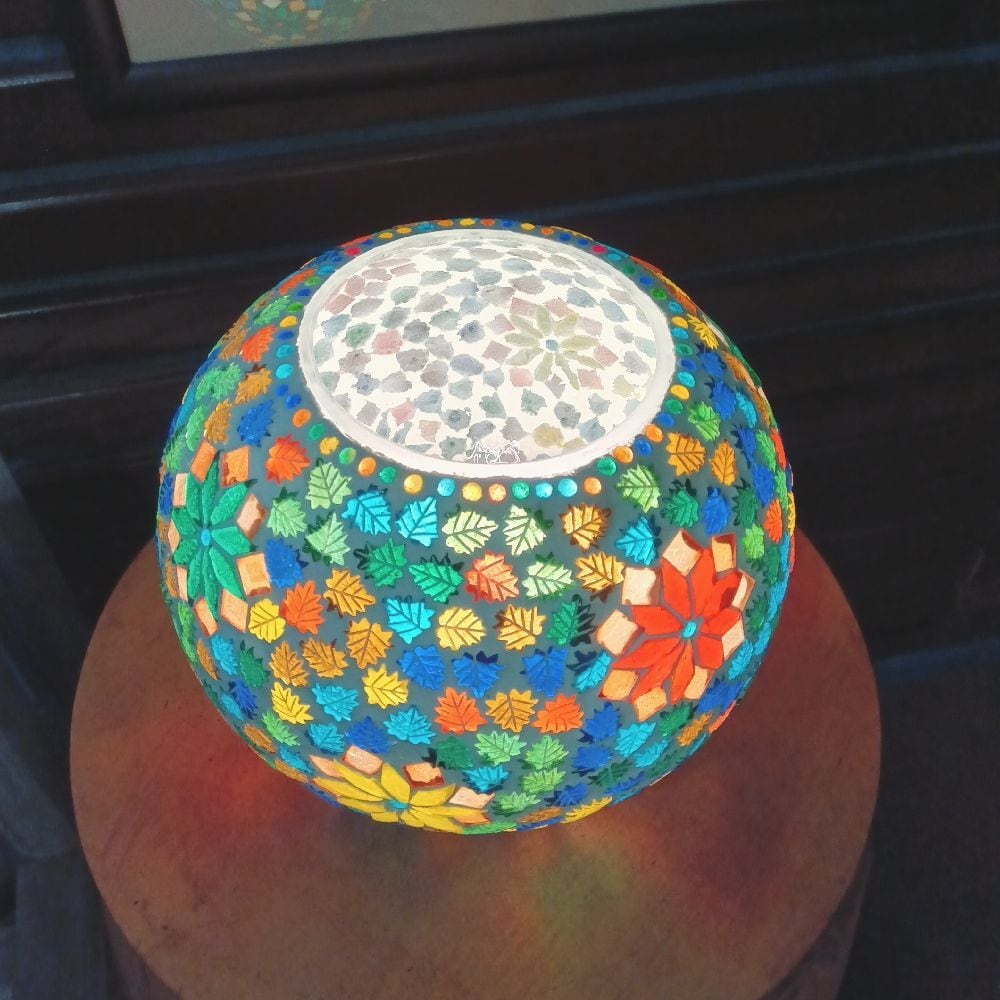 点灯時は、内蔵されたライトの柔らかな光がモザイクガラス全体を透かし、壁やテーブルに美しい光と影のパターンを映し出します。