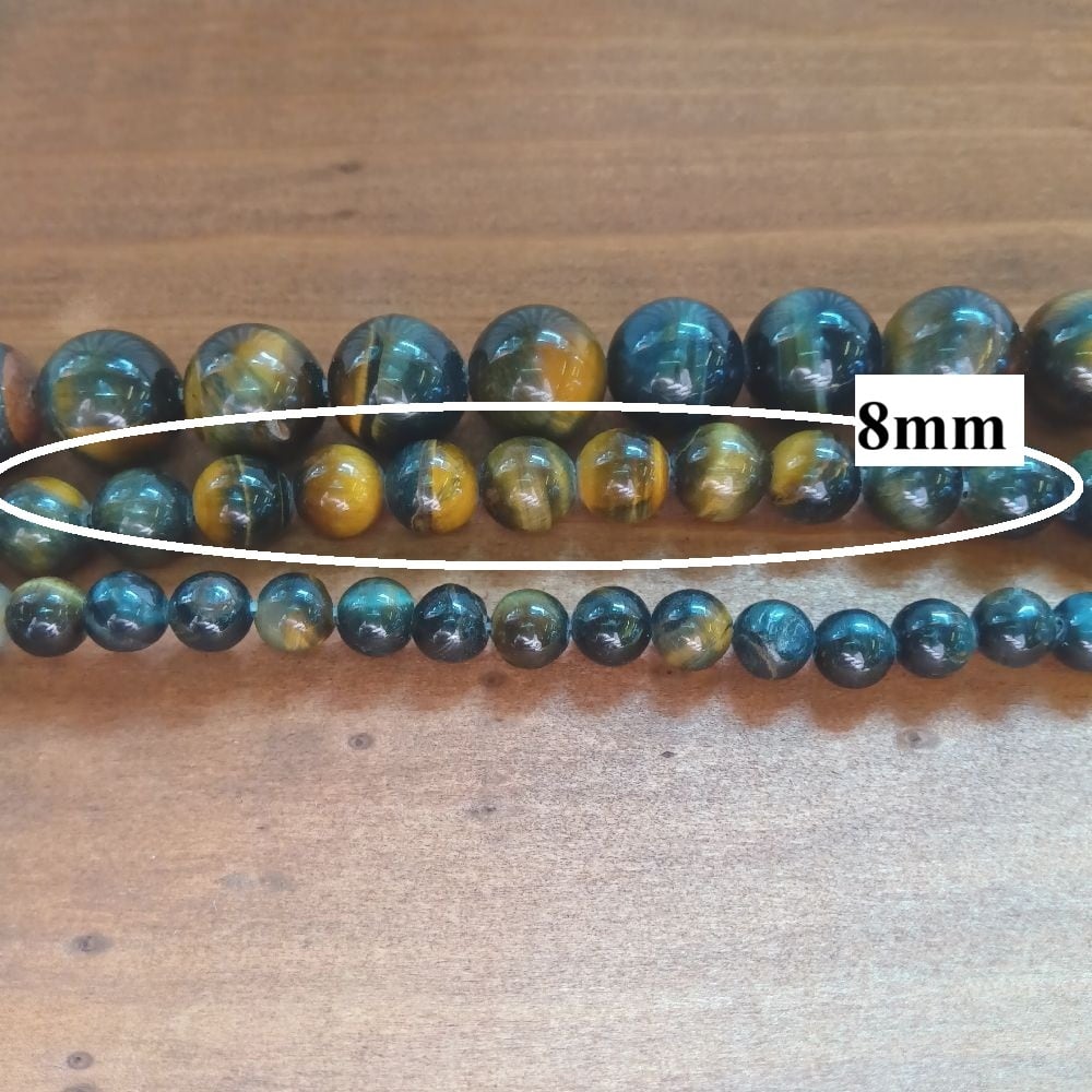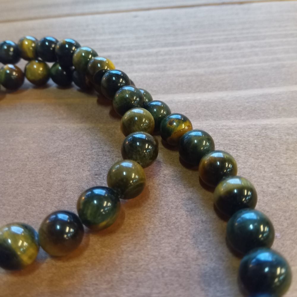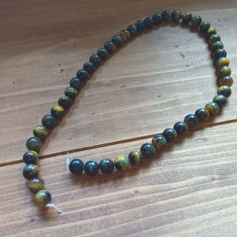 深い藍色をベースに、鮮やかなイエローのラインが混じり合う、非常に表情豊かなブルータイガーアイです。粒によってはグリーンがかって見えるものもあり、一連の中で天然石らしい色のグラデーションを楽しめます。