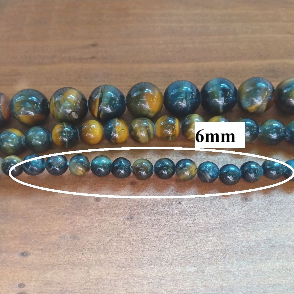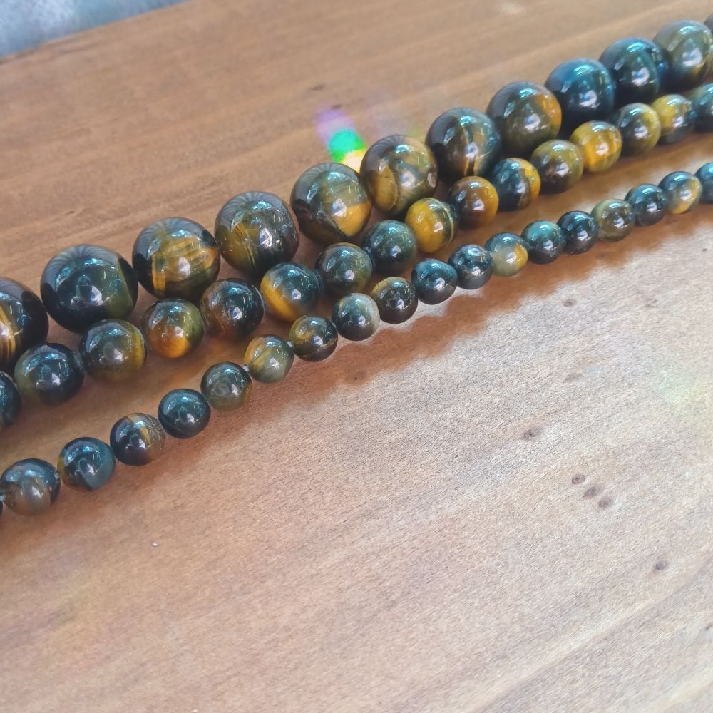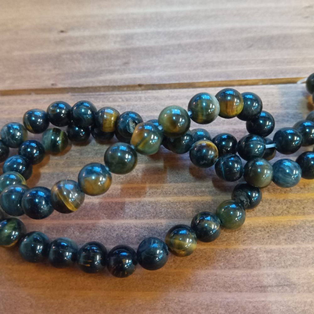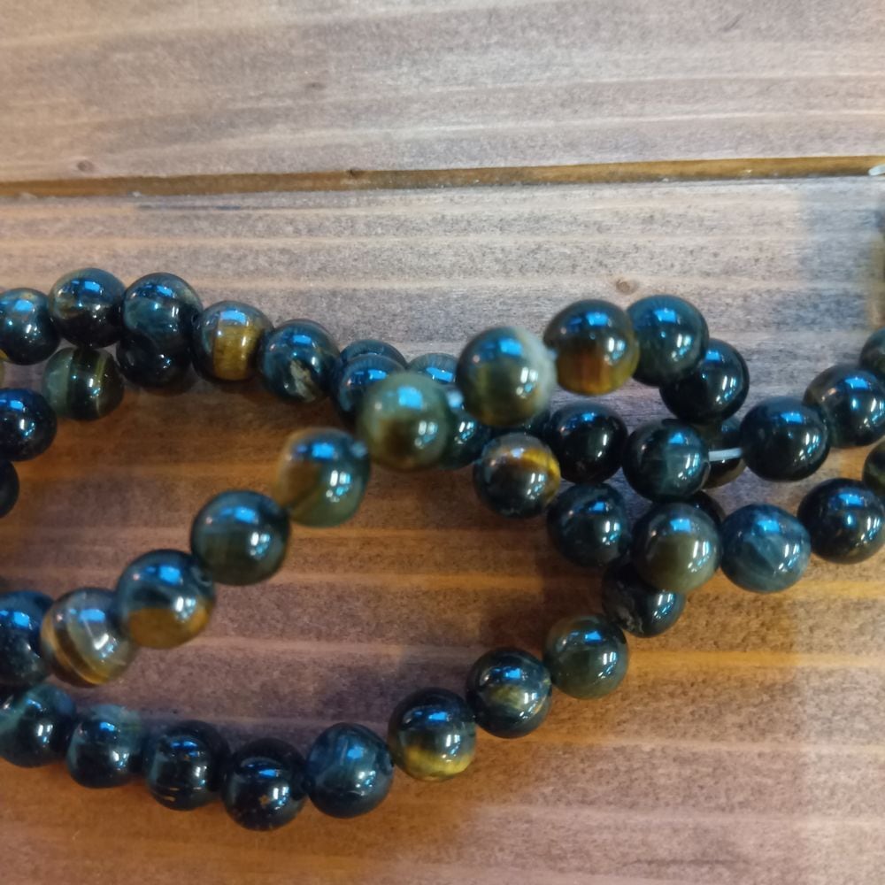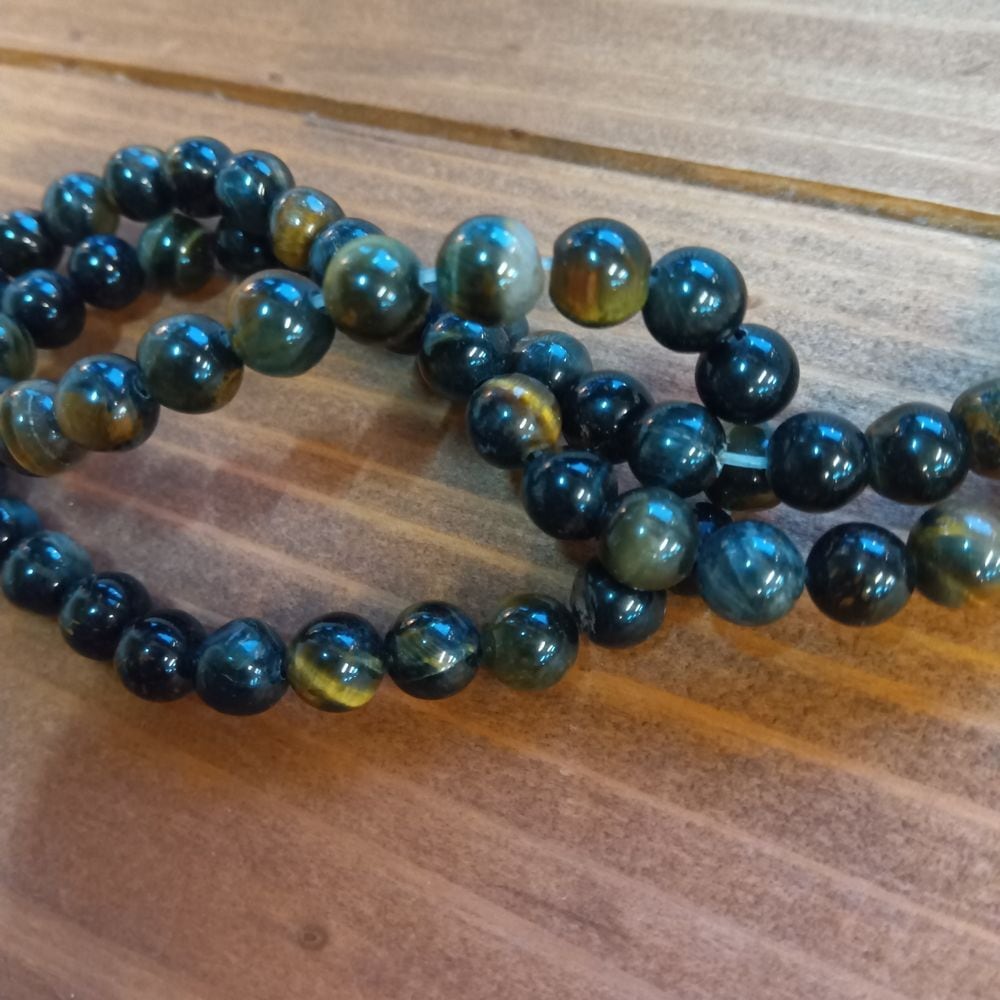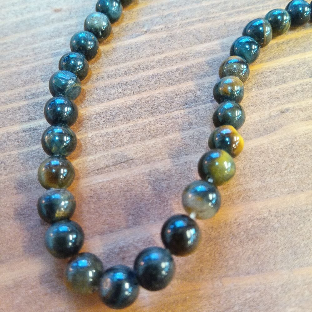 深い藍色をベースに、鮮やかなイエローのラインが混じり合う、非常に表情豊かなブルータイガーアイです。粒によってはグリーンがかって見えるものもあり、一連の中で天然石らしい色のグラデーションを楽しめます。