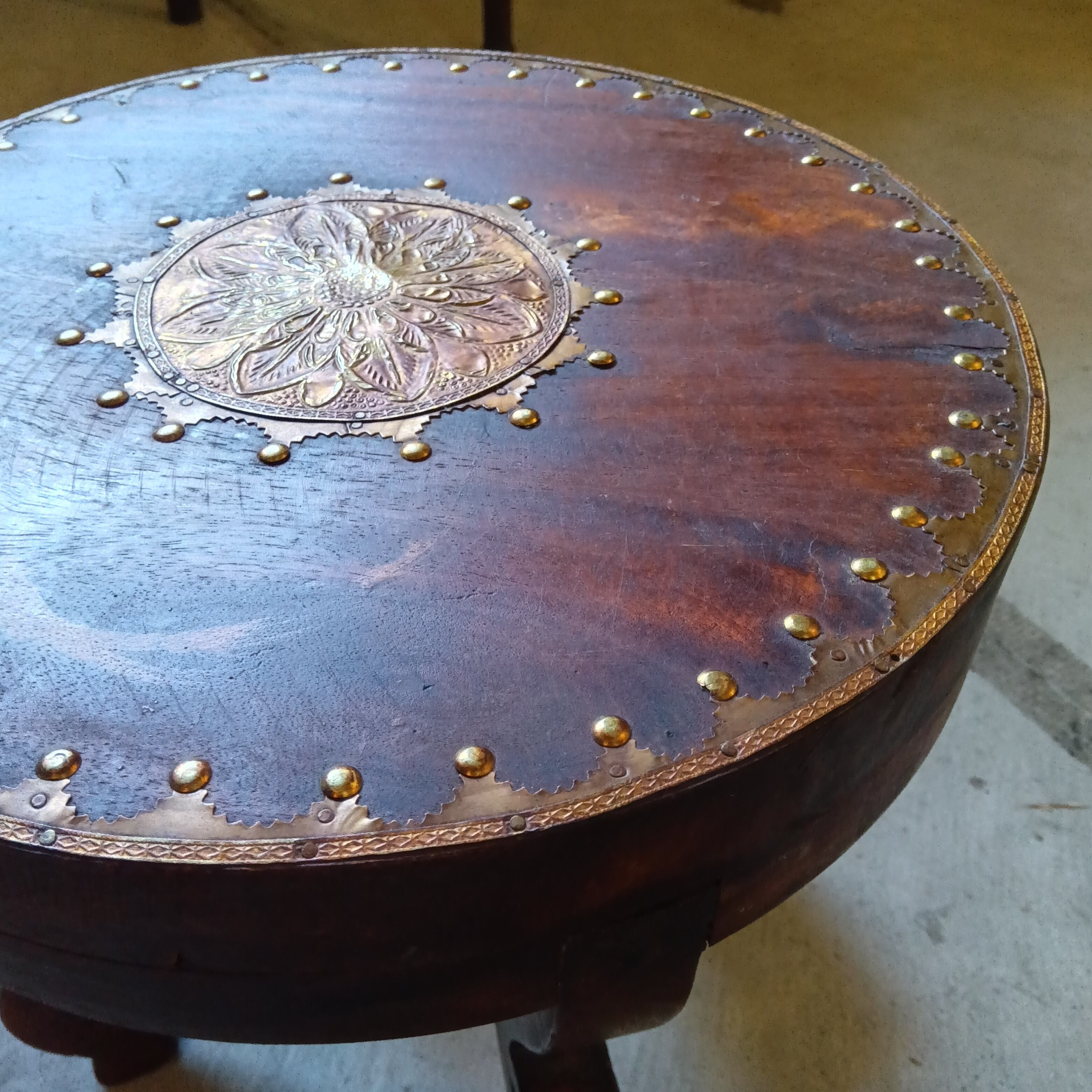 インド ミニテーブル サイドテーブル 木製 花台 置物台 飾り台 アジアン家具 エキゾチック アンティーク風 ヴィンテージ風 銅板 真鍮 エンボス 彫刻 手仕事 プリミティブ インテリア 什器