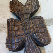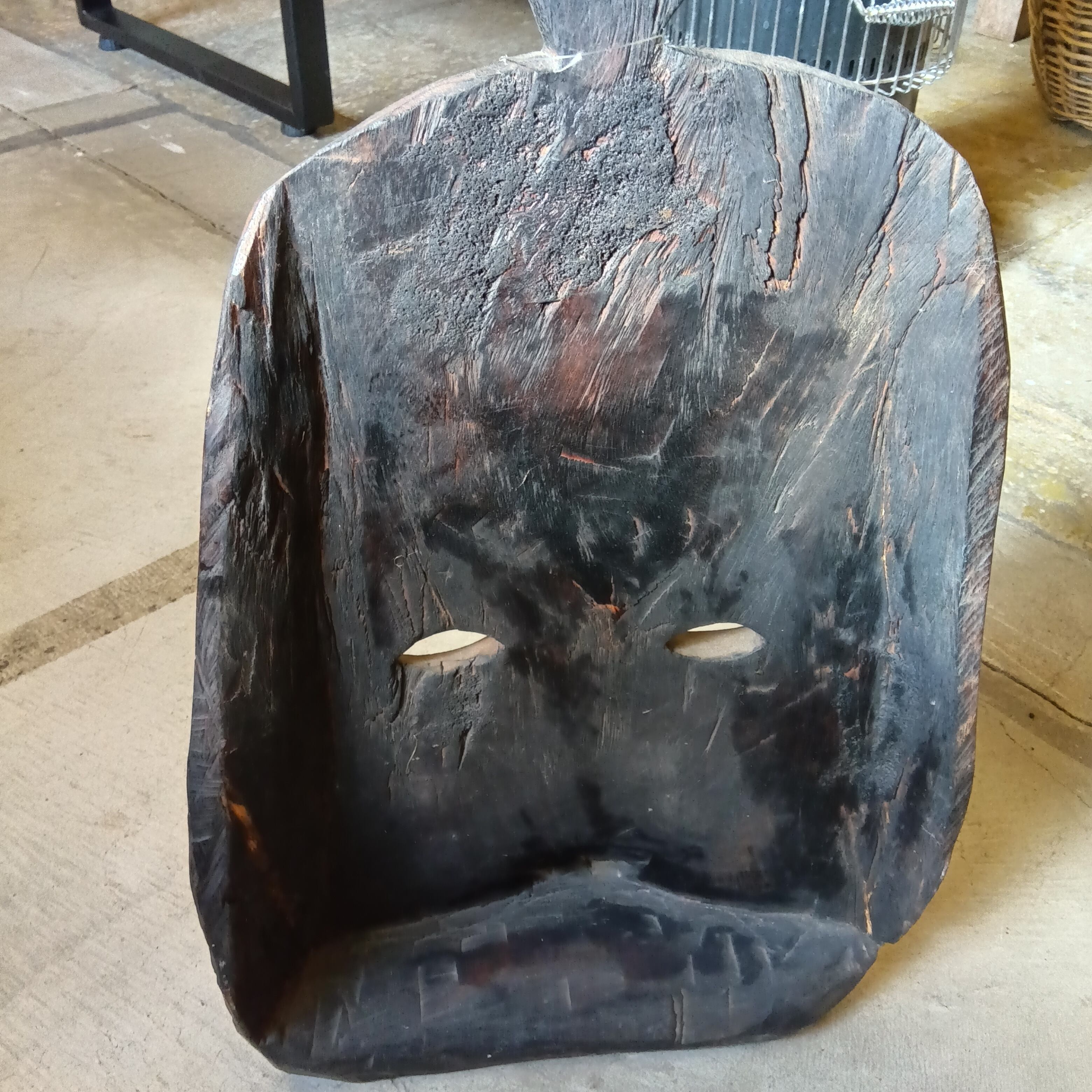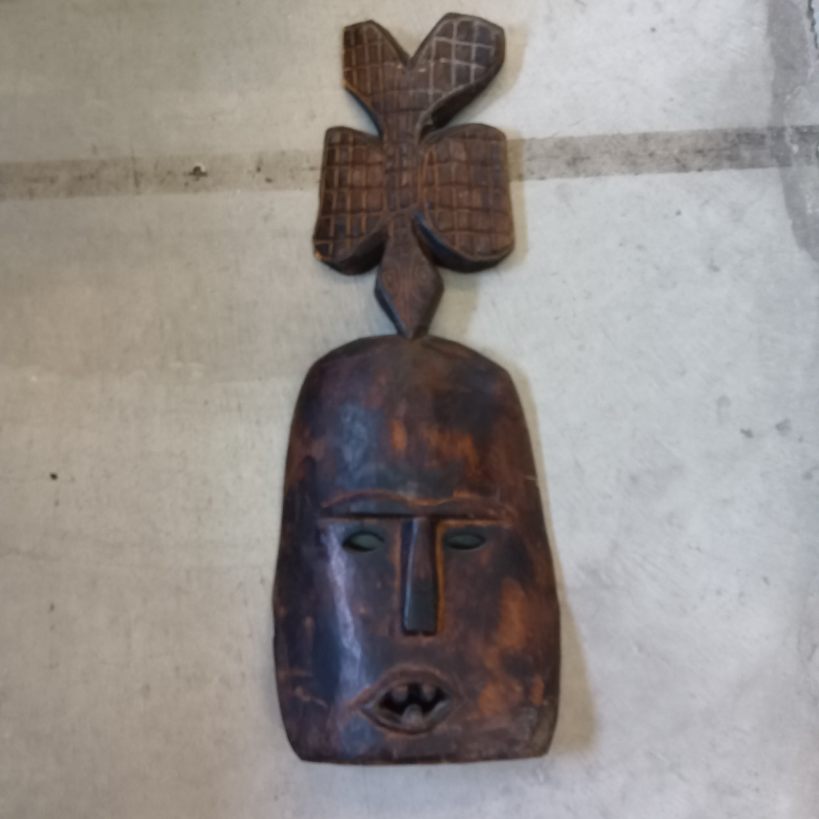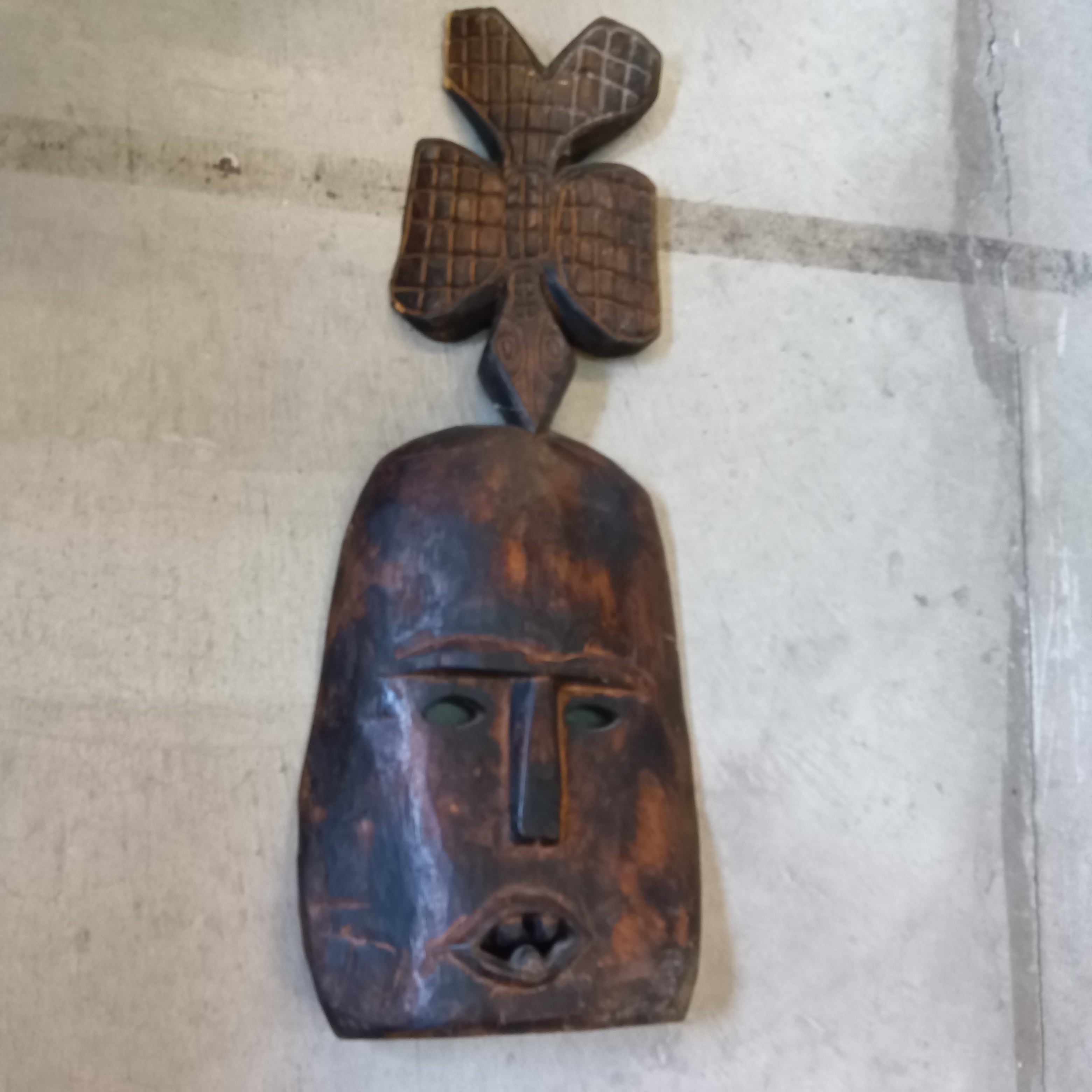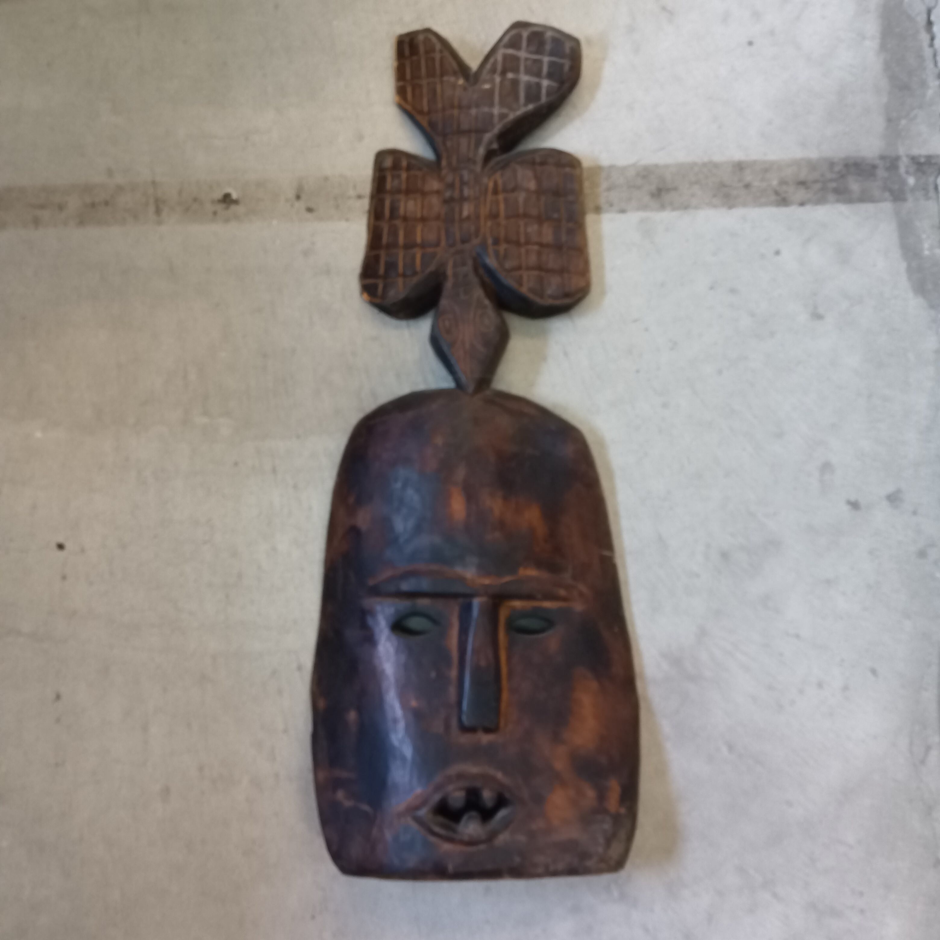インドネシア現地で仕入れた、圧倒的なスケール感を誇る一点物の木彫りマスクです。 最大の特徴は、頭上にそびえ立つ見事な髪飾り(ヘッドドレス)のような装飾。緻密な格子状の幾何学彫りが施されており、現地では神聖な象徴として尊ばれるデザインです。この装飾があることで、通常のマスクよりもさらに高く、伸びやかなシルエットを実現しています。