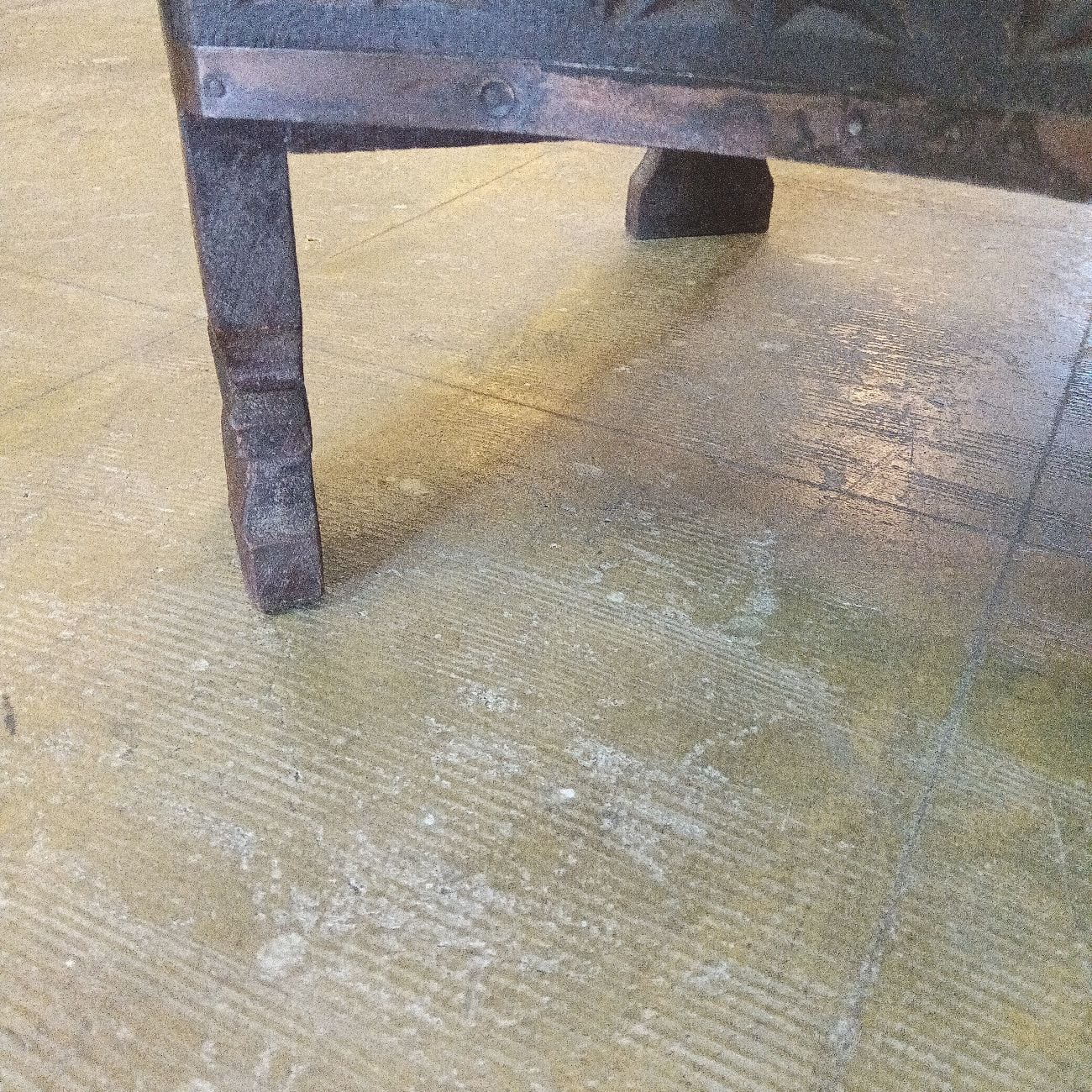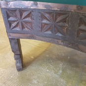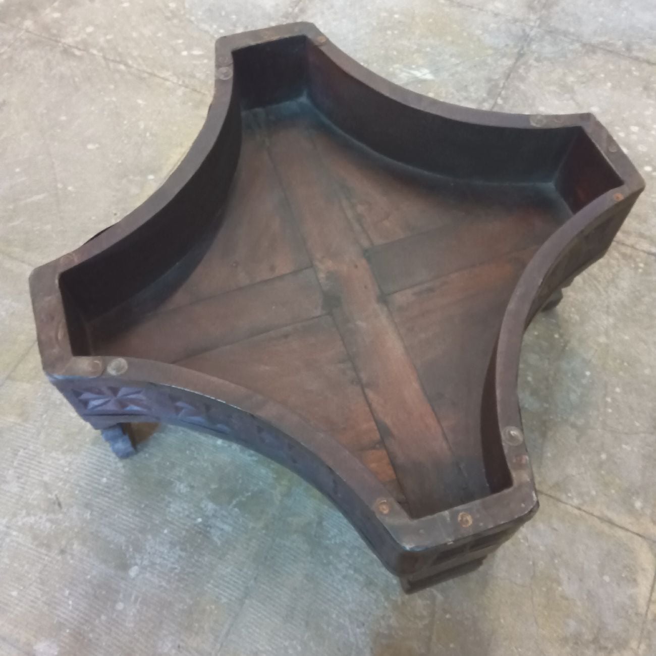 長い年月を経て、角が取れ、しっとりと落ち着いた色味に変化した古い木製のローテーブル。 職人の手によって一つひとつ彫り込まれた星文様や、鈍い光を放つ金属の縁取りが、現代の既製品にはない「唯一無二の存在感」を放ちます。