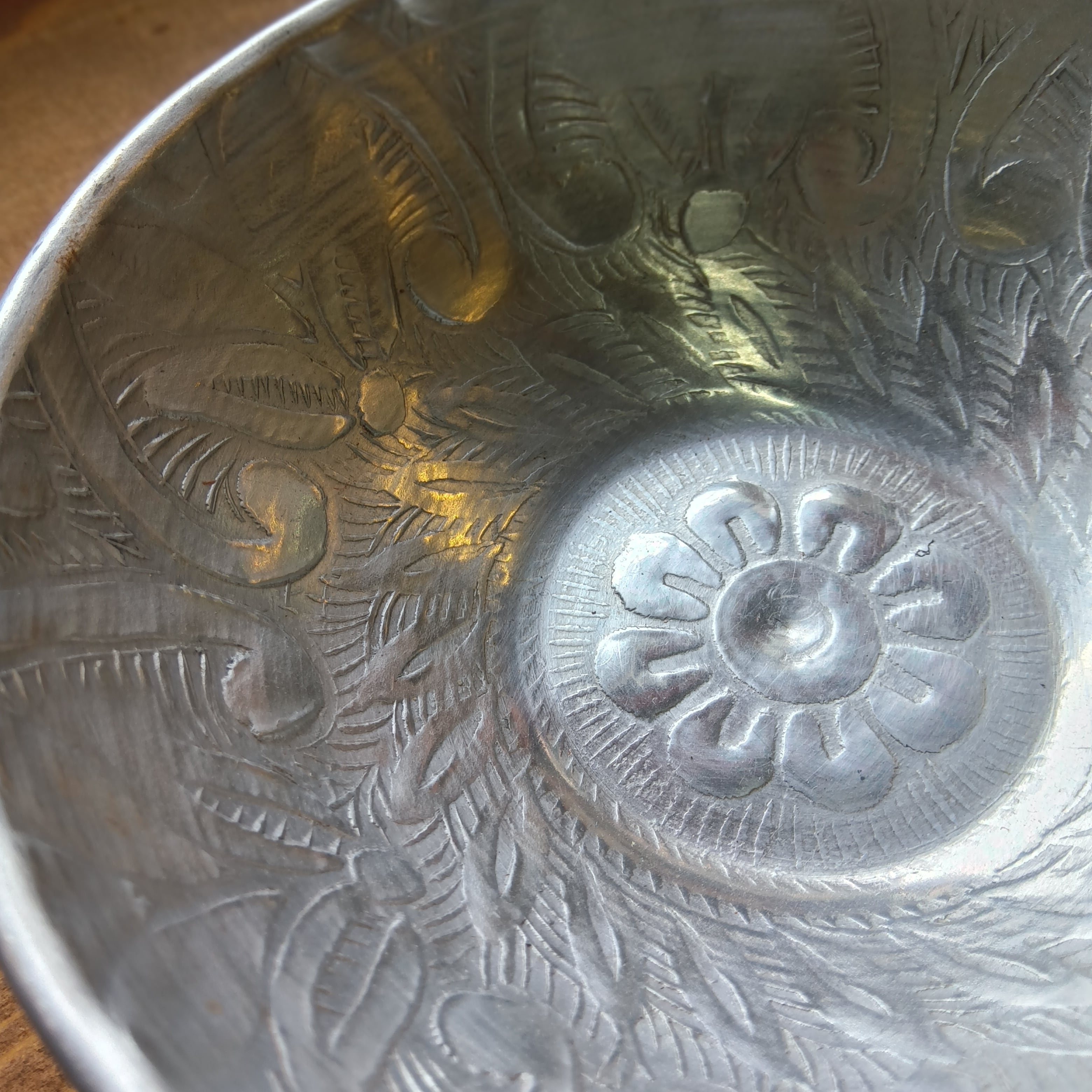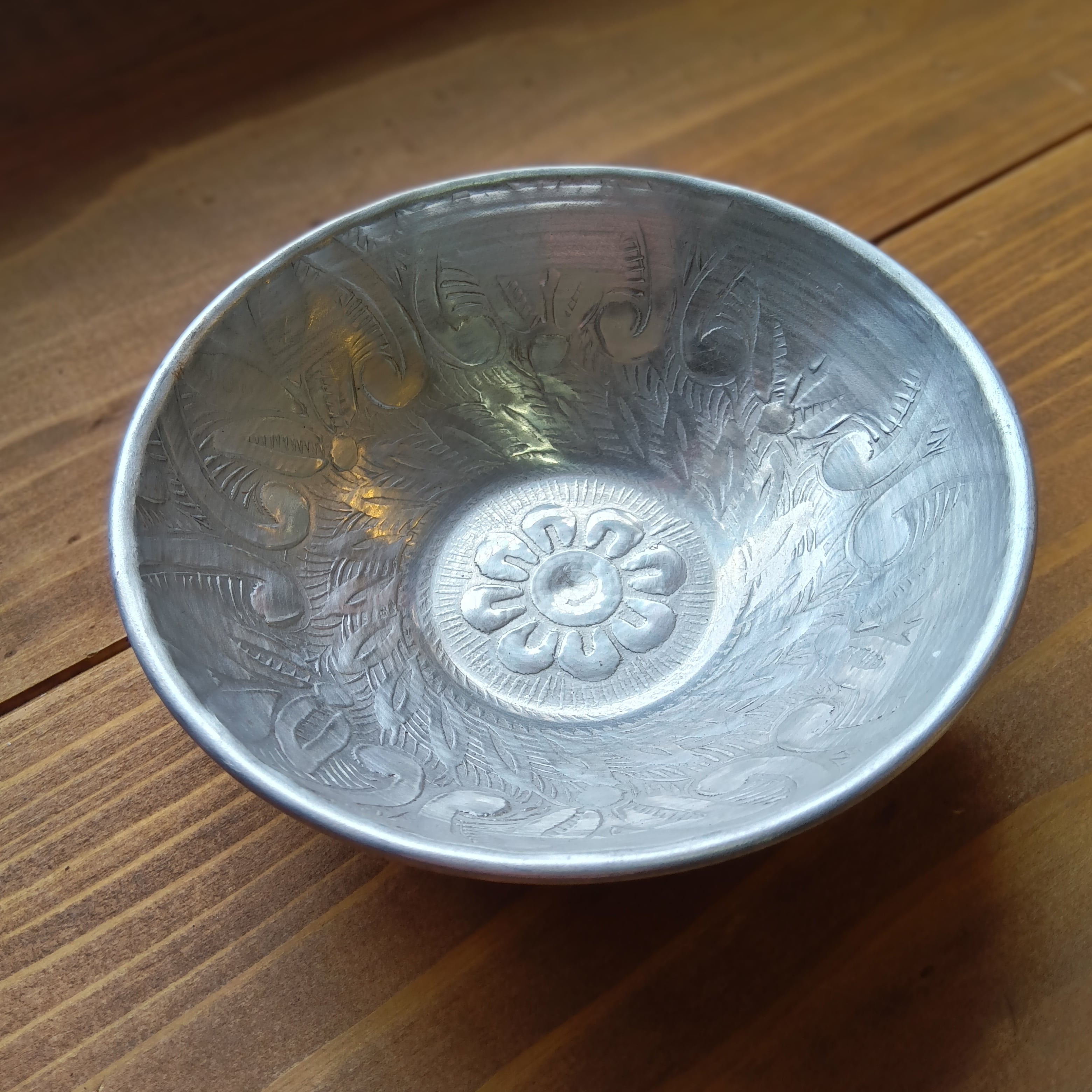 【インド・モラダバード産】手打ちアルミの装飾ボウル(M)/ 大輪のフラワーレリーフ