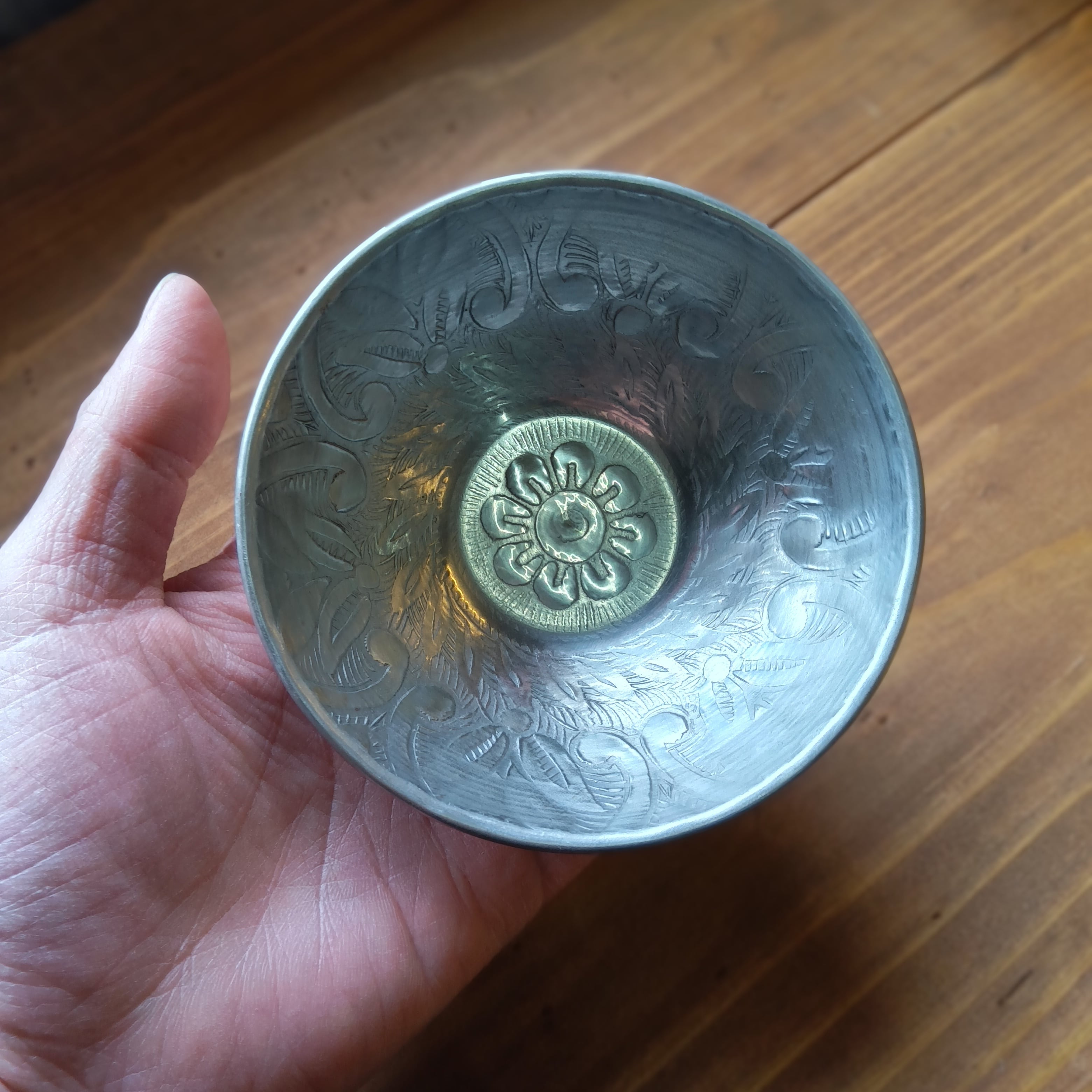 ■ 華やかな大輪の花と、深みのある形 こちらのモデルは、中央にほどこされた存在感のある花模様が特徴です。底面から縁にかけて広がる繊細な彫り模様が、アルミ特有の鈍い光沢と重なり、アンティークのような奥深い表情を見せてくれます。