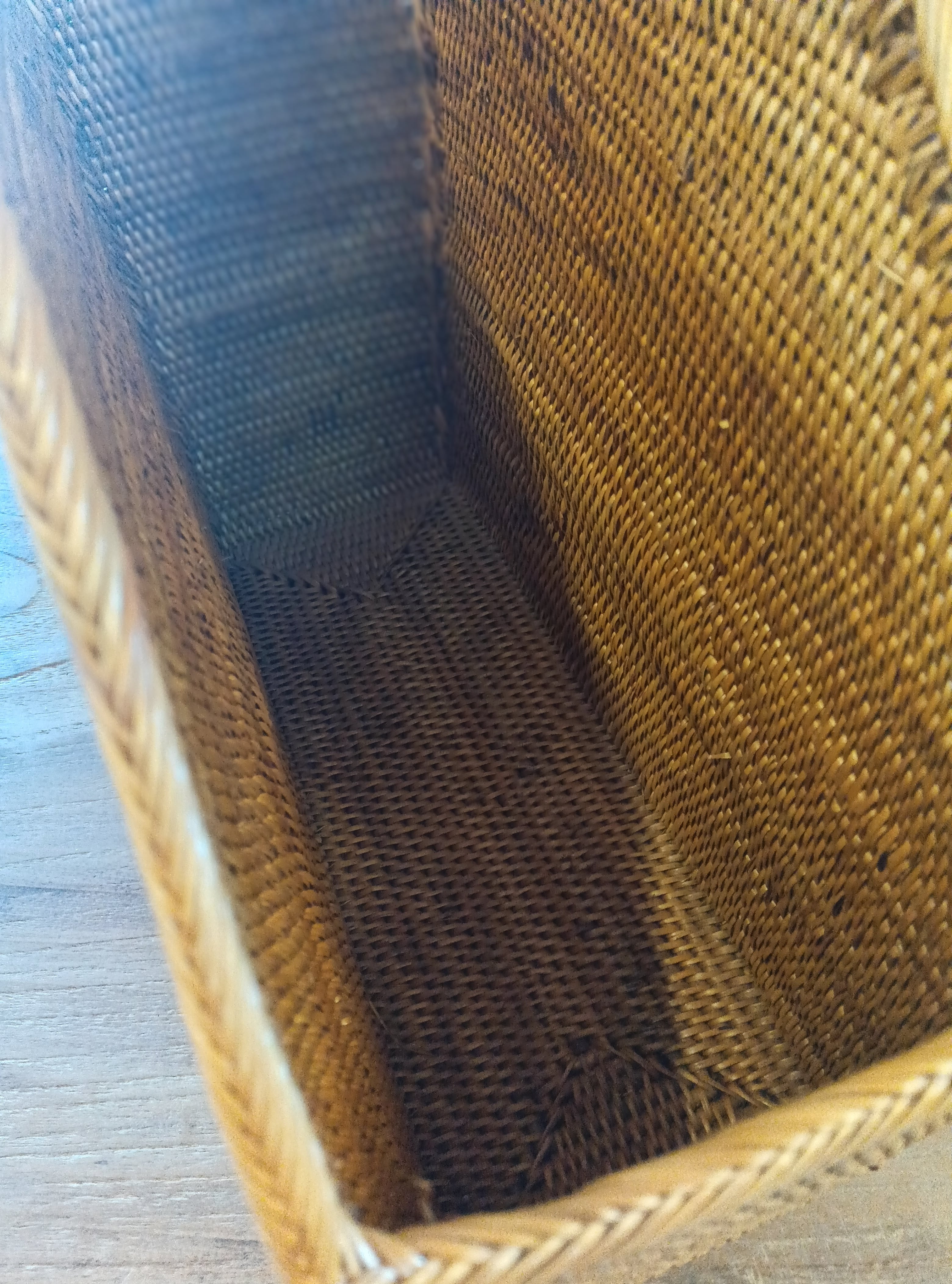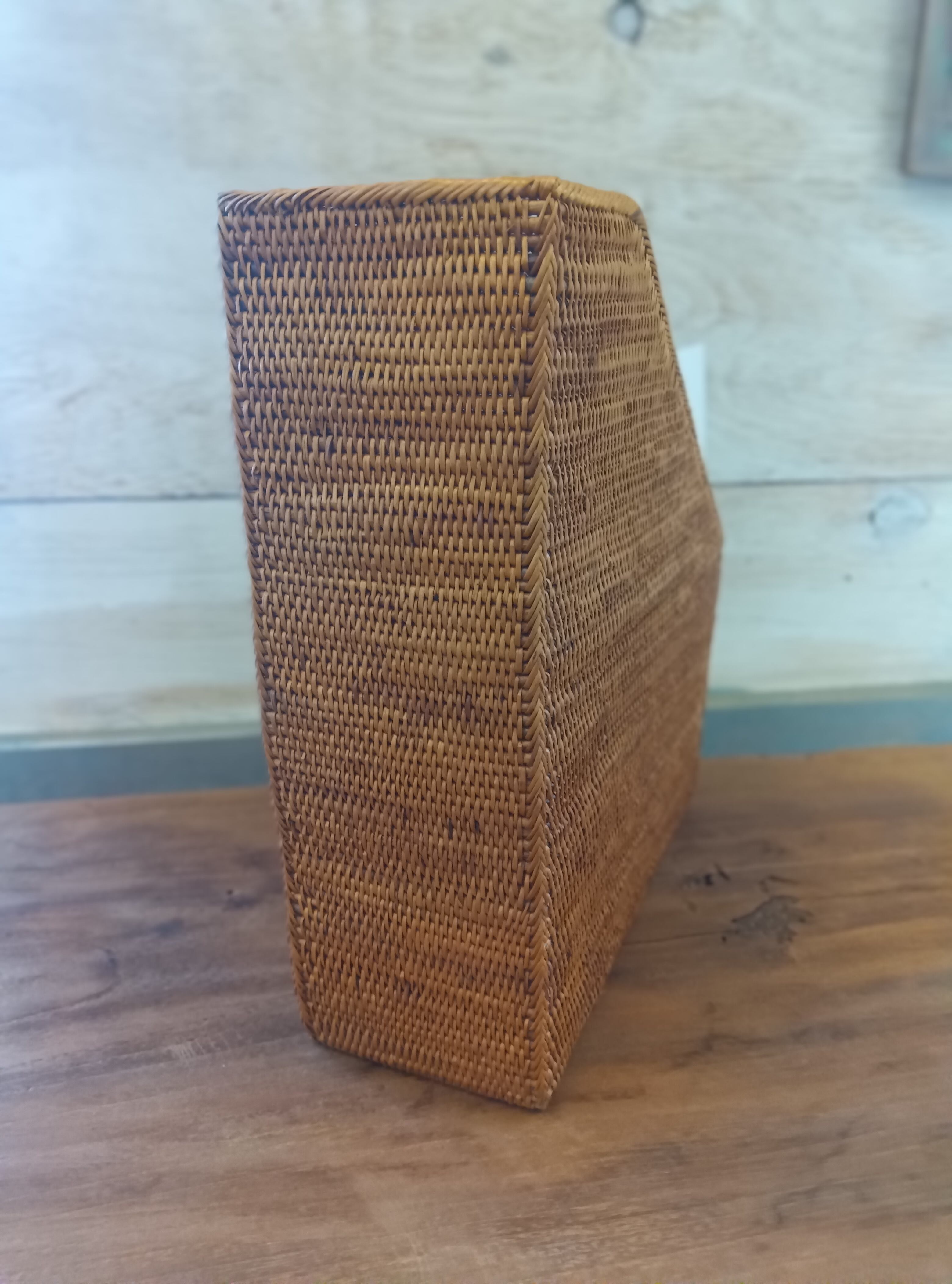使いやすさを考えたフォルム 斜めにカットされたデザインは、中に入れた書類や雑誌の出し入れをスムーズにします。また、編み込みの仕上げに燻(いぶ)し工程を加えているため、防虫・防カビ効果があり、長く愛用できる「一生もの」の収納アイテムです。