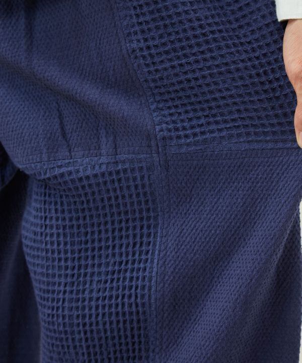 異なる色味の生地を大胆に組み合わせ、ワッフルのような凸凹とした質感が表情豊かな一着です。