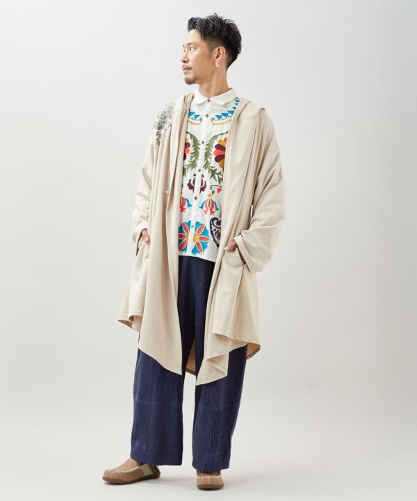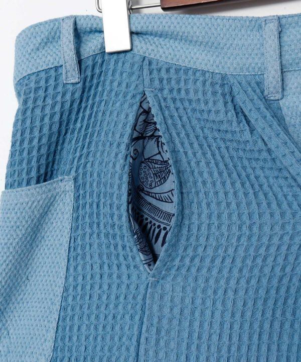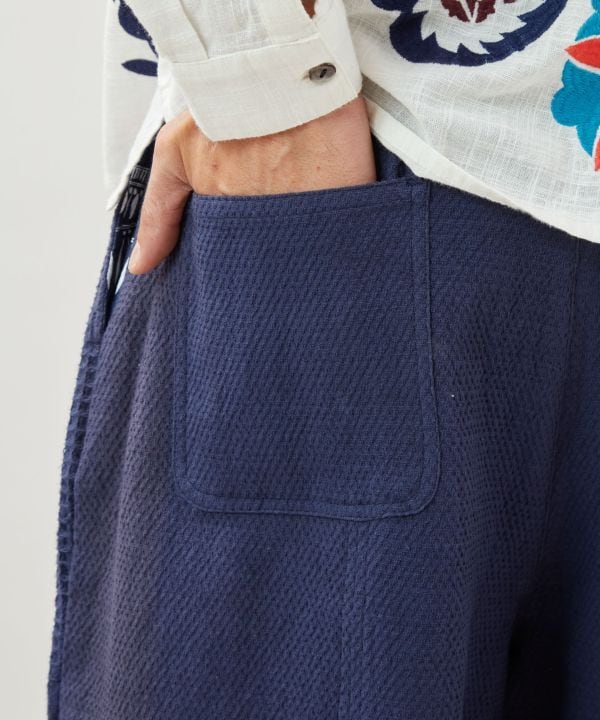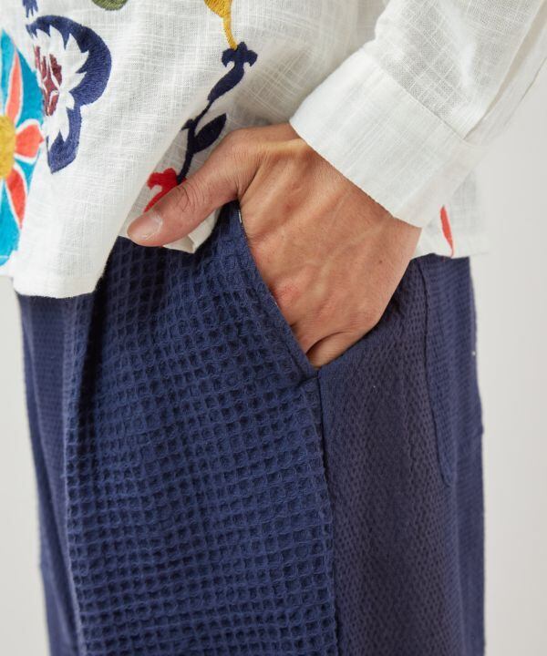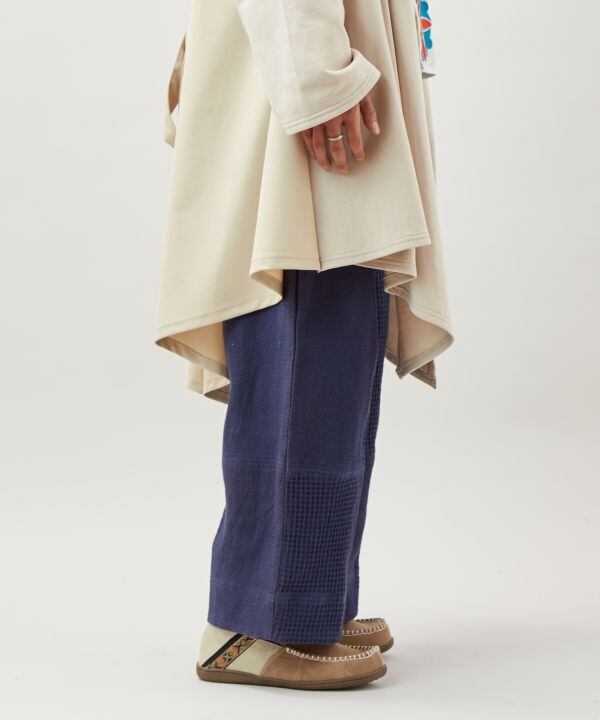 ゆったりとしたワイドシルエットながら、裾やポケットの内側に忍ばせた幾何学模様のプリントが、動くたびにさりげない個性を演出。