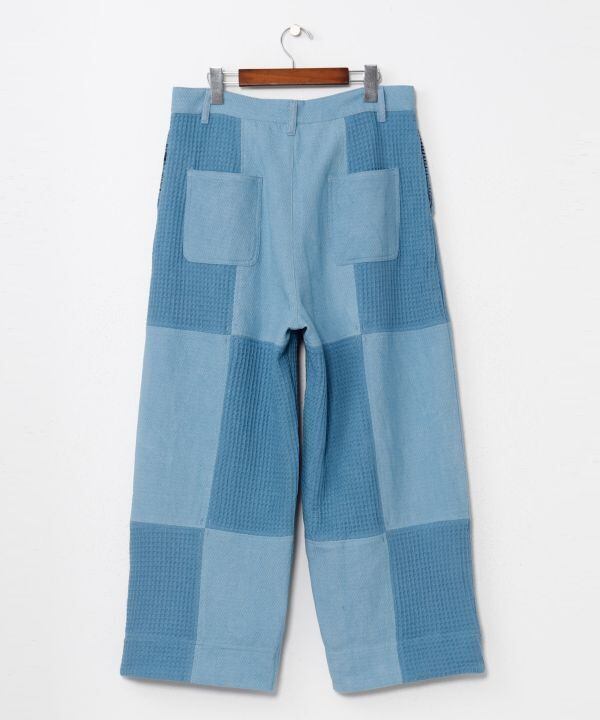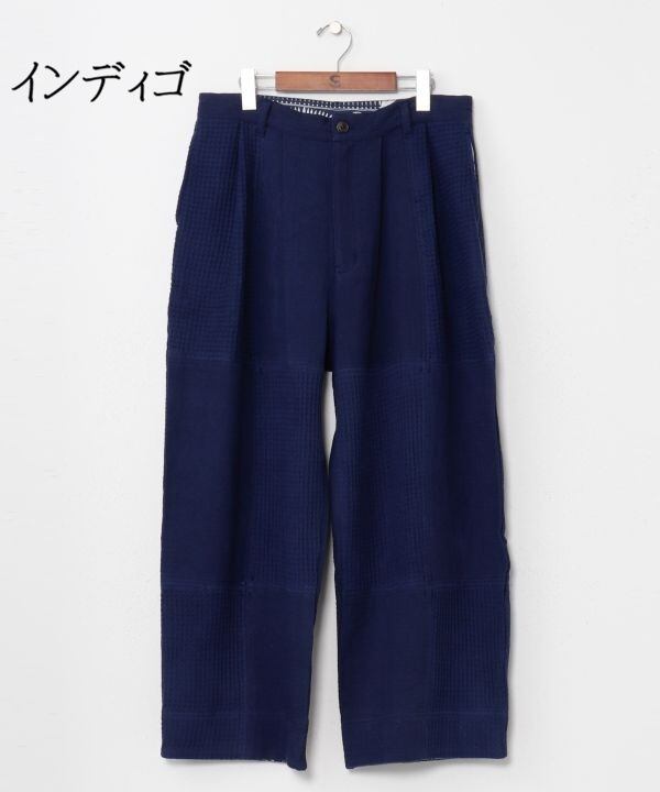 伝統的な技法を現代的なシルエットに昇華させた、インディゴ染めのパッチワークパンツ。