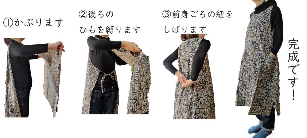 後ろ身頃の紐をおなか前で結び、前身頃の紐を後ろで結ぶフリーサイズエプロン。