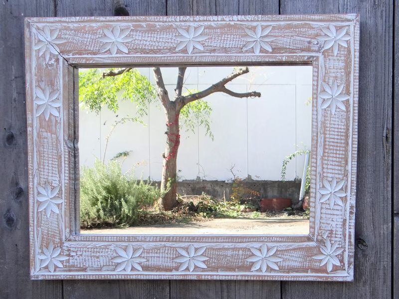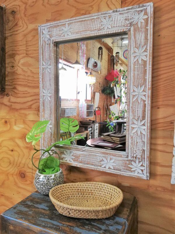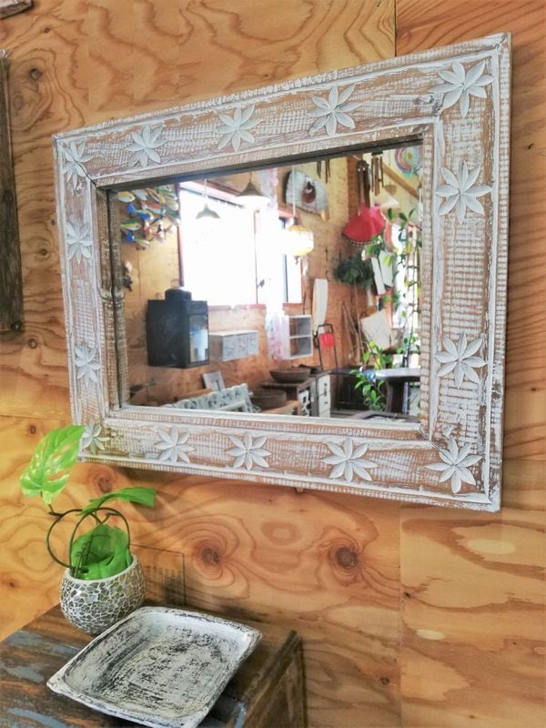 ミラー 壁掛け 木製 ウッド フレーム おしゃれ 木彫り レリーフ ハンドメイド 天然木 アジアン雑貨 バリ レトロ アンティーク風 シャビー 26 37 新生活