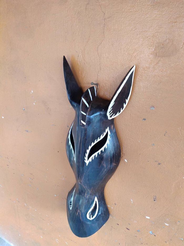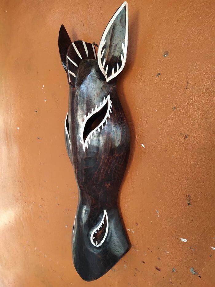 魅力的で繊細な木彫りの壁掛けオブジェ、馬のお面です。