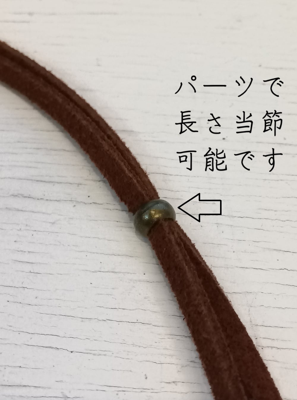 ※革ひも(フェイクレザーコード)とメタルパーツで出来た、長さを調節できるコードを取り付けた状態で発送いたします。