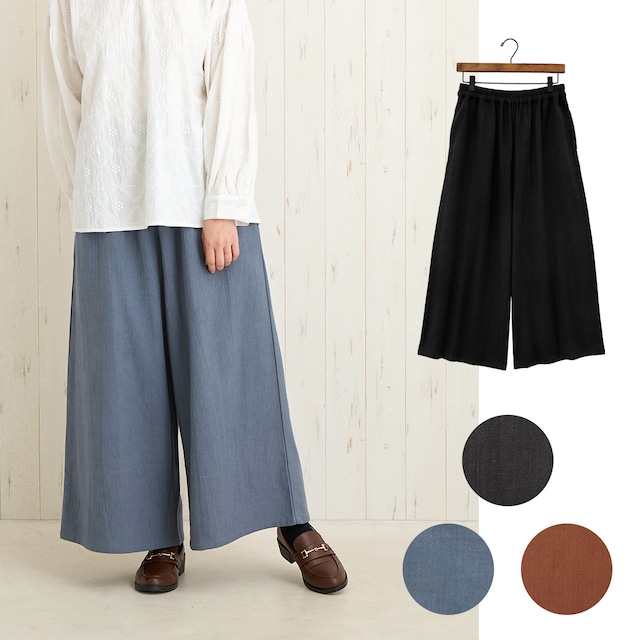 【インド綿100% ヘリンボーン織りの上品なワイドパンツ】 シンプルなデザインながら、ディテールにこだわった着回し力抜群のワイドパンツです。 素材にはインド綿100%を使用し、地厚でしっかりとしたヘリンボーン織りの生地を採用しています。 「ヘリンボーン(魚の骨)」のような模様が斜めに並んだ上品な織り柄が、生地に奥行きと表情を与え、シンプルなシルエットでも「高見え」する洗練された印象を与えます。 【リラックスと上品さを両立したデザイン】 ゆったりシルエット: 裾に向かって広がるワイドシルエットで、脚のラインを拾わず体型カバーにも役立ちます。 歩くたびに揺れるドレープが女性らしい優雅な雰囲気を演出します。 ストレスフリーなウエスト: ウエストは総ゴム仕様で、締め付け感がなくリラックスした穿き心地です。 内側にはドローストリング(紐)も付いており、サイズ調整が可能です。 ・着回し力: どんなトップスとも合わせやすいベーシックなカラー展開(ブラック、テラコッタ、ブルー系)とデザインで、カジュアルからきれいめスタイルまで幅広く活躍します。 【さらっと快適なインド綿】 通気性・吸湿性に優れたインド綿は、肌触りが良く、快適な穿き心地を保ちます。裏地はありませんが、地厚なヘリンボーン生地のため、インナーのラインを拾いにくいのもポイントです。ロングシーズン着用いただけます。 <商品詳細>サイズ着丈(CF~)約89cm、ウエストゴム上り 約68cm素材綿 100%(ヘリンボーン)生産地インド備考裏地なし